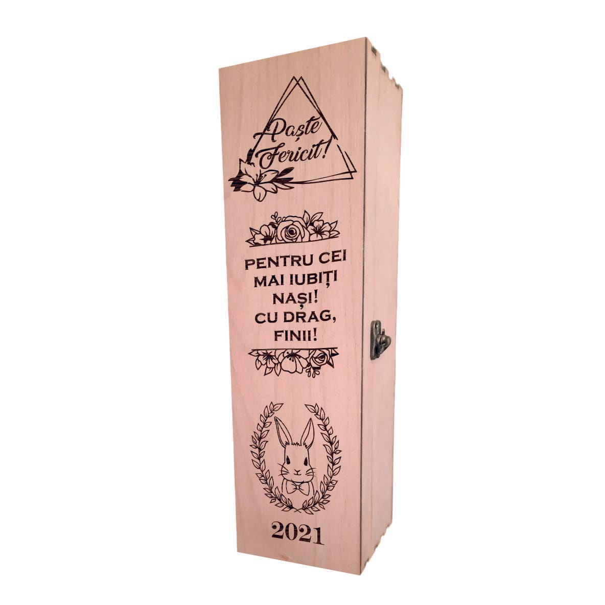 Realizată din lemn, cu dimensiuni de 35 × 10 × 10 cm, cutia este concepută pentru a susține și proteja o sticlă standard de vin. Materialul natural oferă rezistență, stabilitate și un aspect elegant, potrivit atât pentru ocazii festive, cât și pentru momente cu încărcătură emoțională. Prin personalizare, cutia capătă un caracter unic, adaptat persoanei care o primește, devenind mai mult decât un simplu ambalaj.