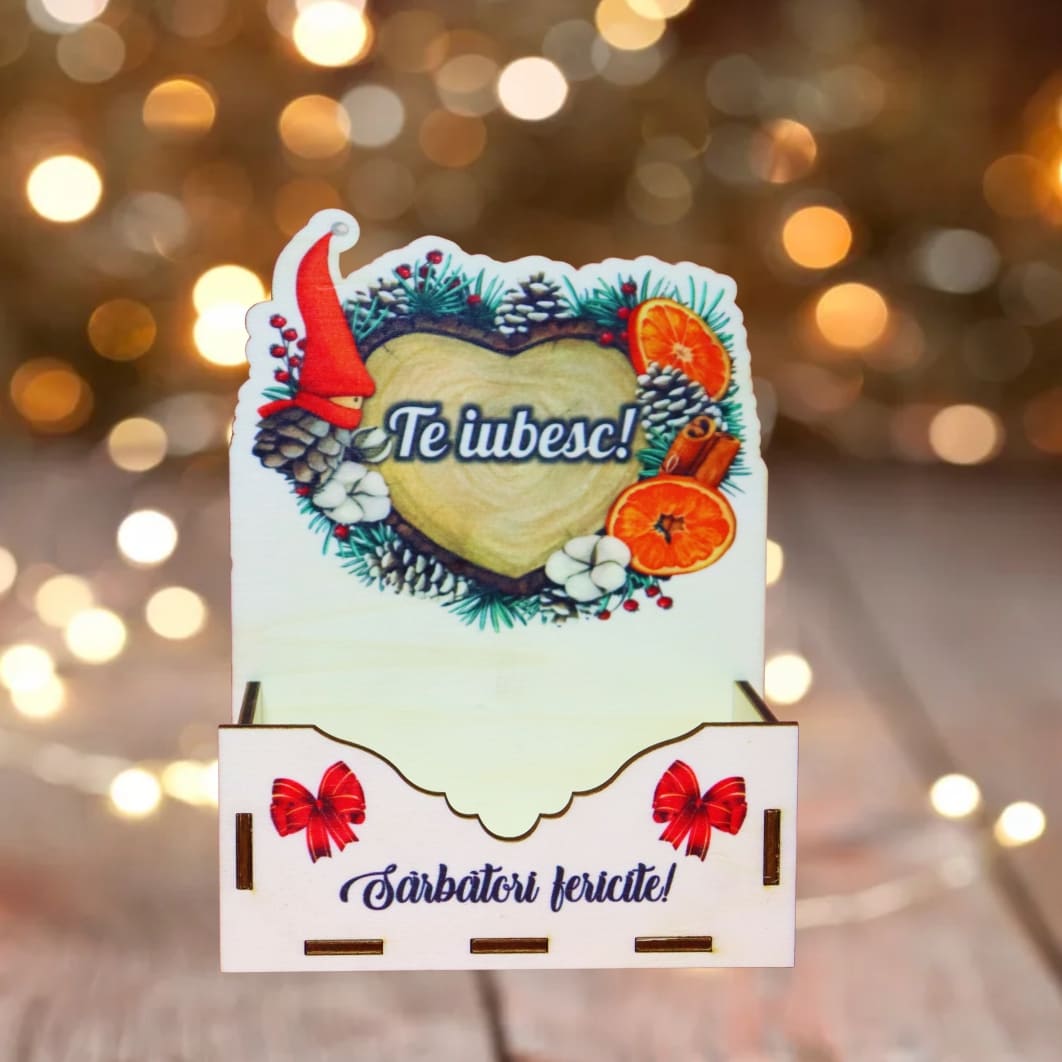 Cutie din lemn pentru aranjamentele florale cu motiv de Craciun.
