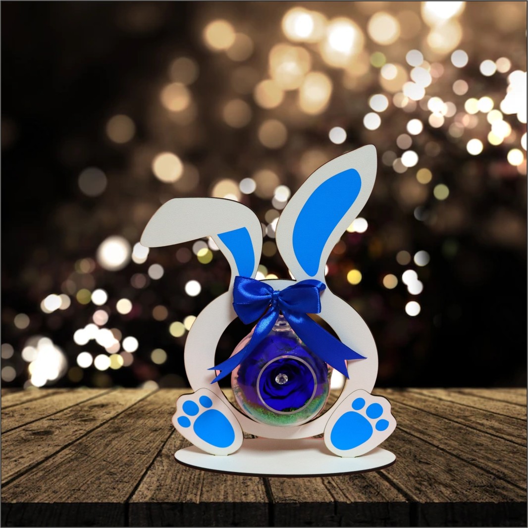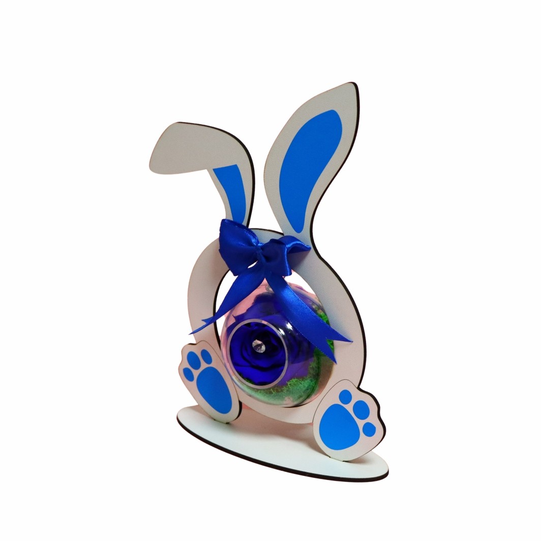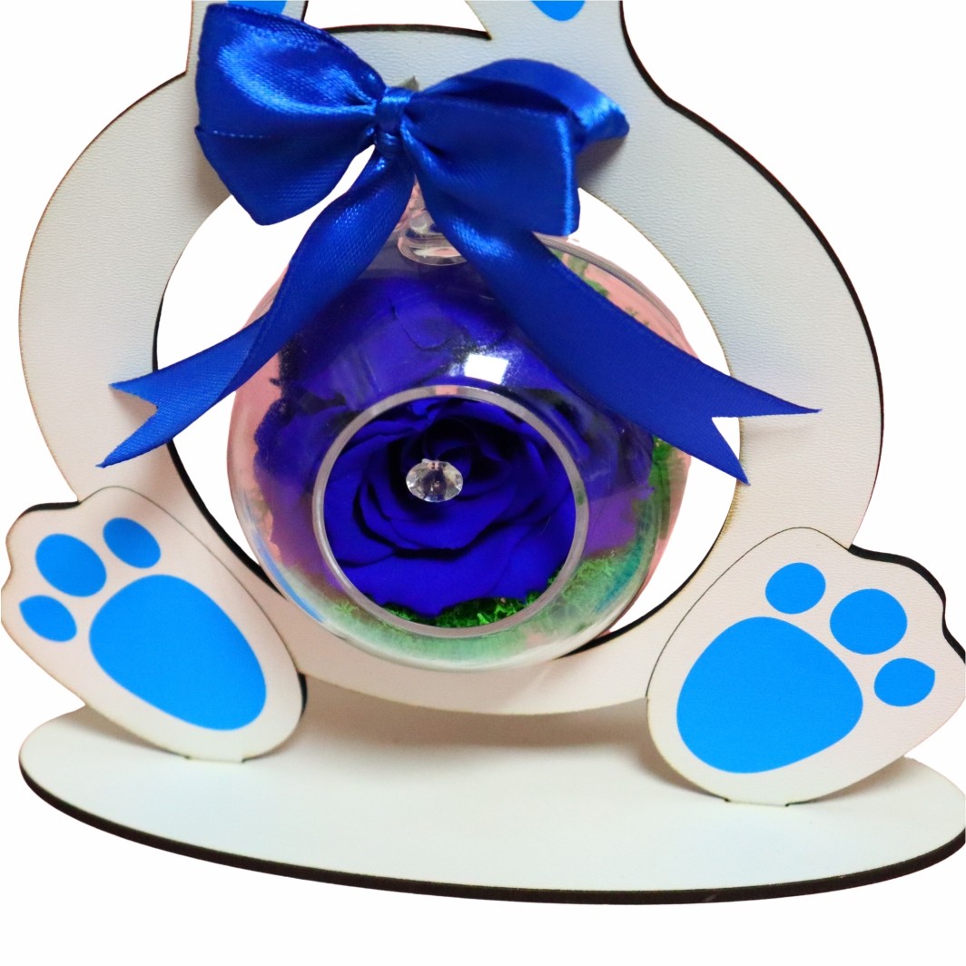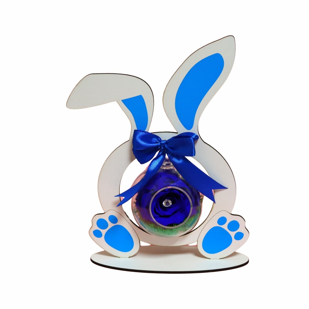 Suport in forma de iepure din lemn colorat prin print UV cu glob, trandafir criogenat albastru si licheni verzi.