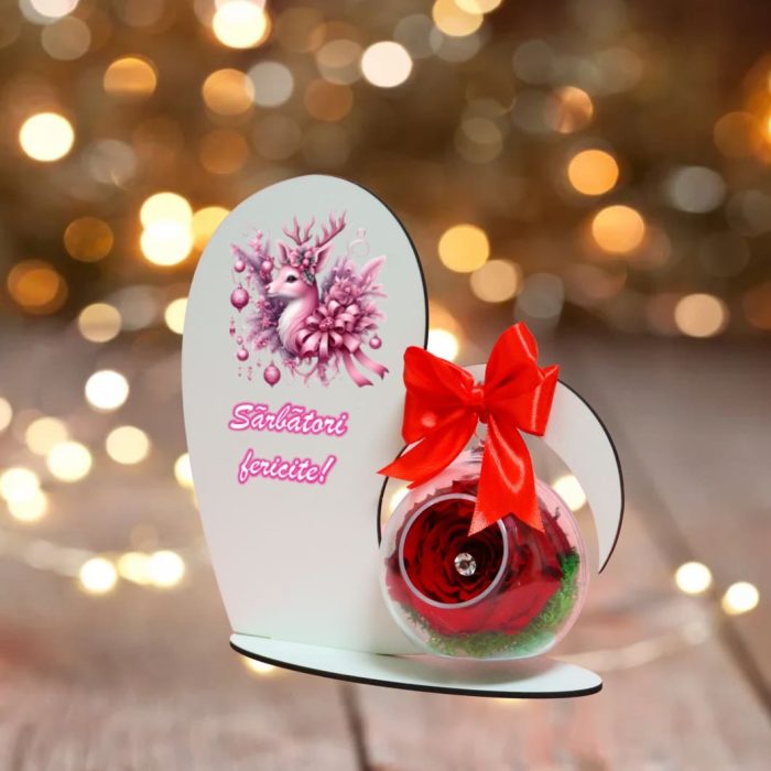 Suport in forma de inimă din lemn colorat prin print UV cu glob, trandafir criogenat rosu si licheni verzi.