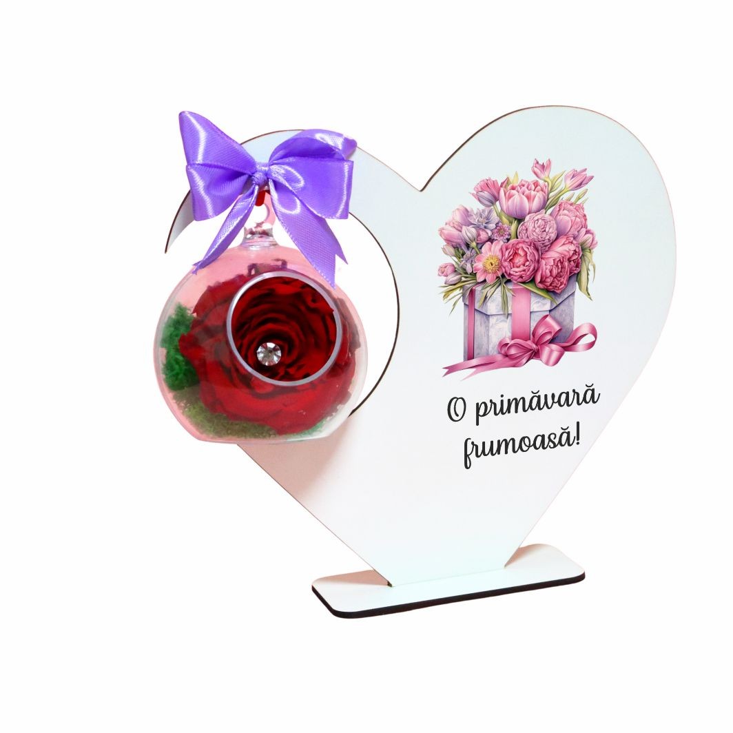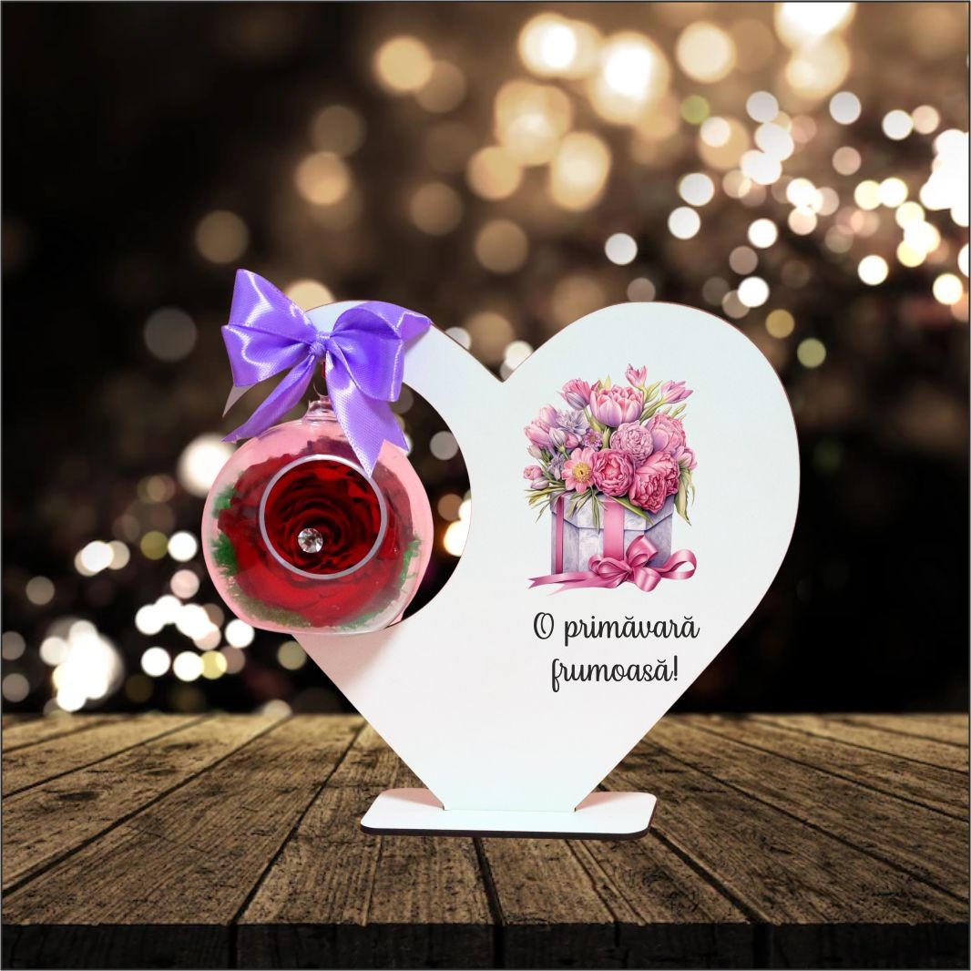 Suport in forma de inimă din lemn colorat prin print UV cu glob, trandafir criogenat rosu si licheni verzi.