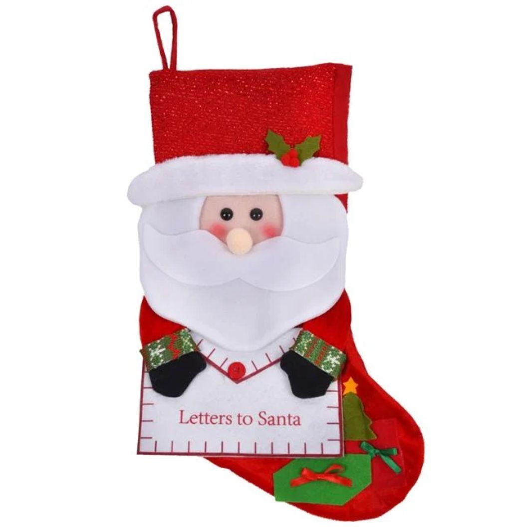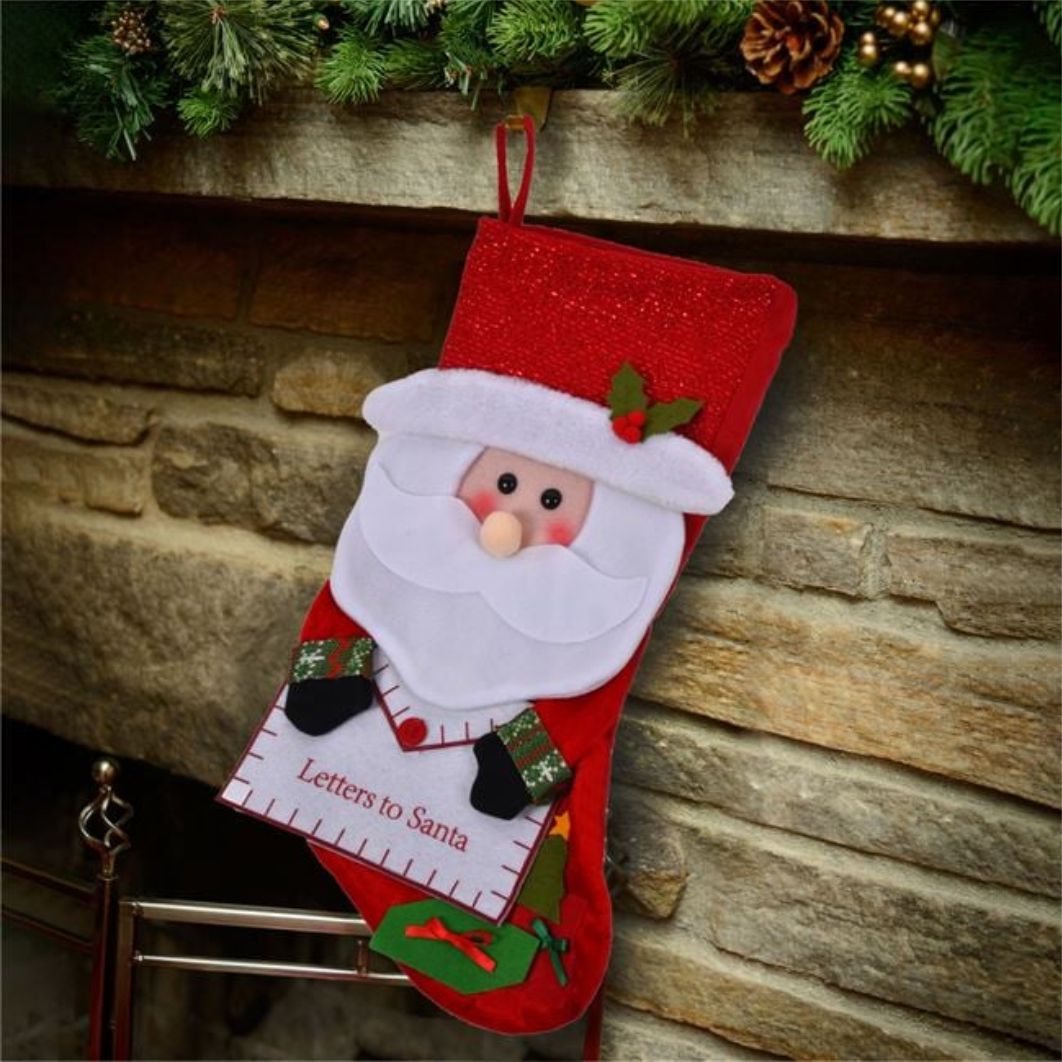 Cizma decorativa de Craciun, rosie cu detalii rosii tinsel, model Mos Craciun 3D si plic ce se dechide pentru scrisoare sau cadou.