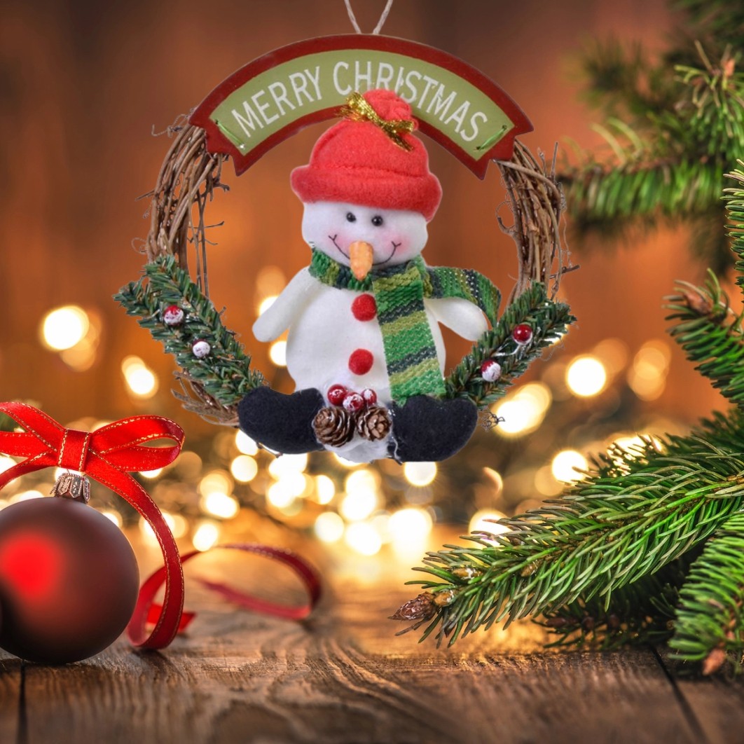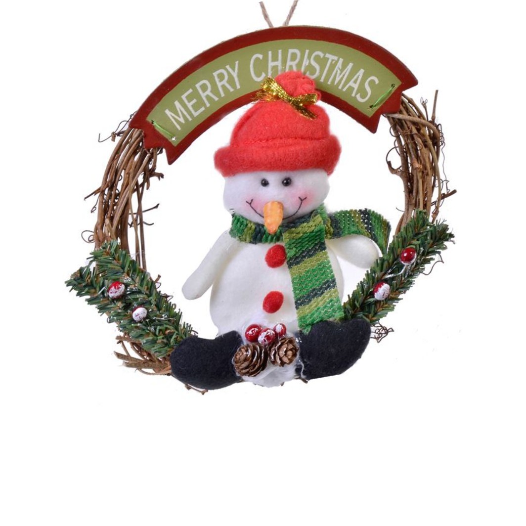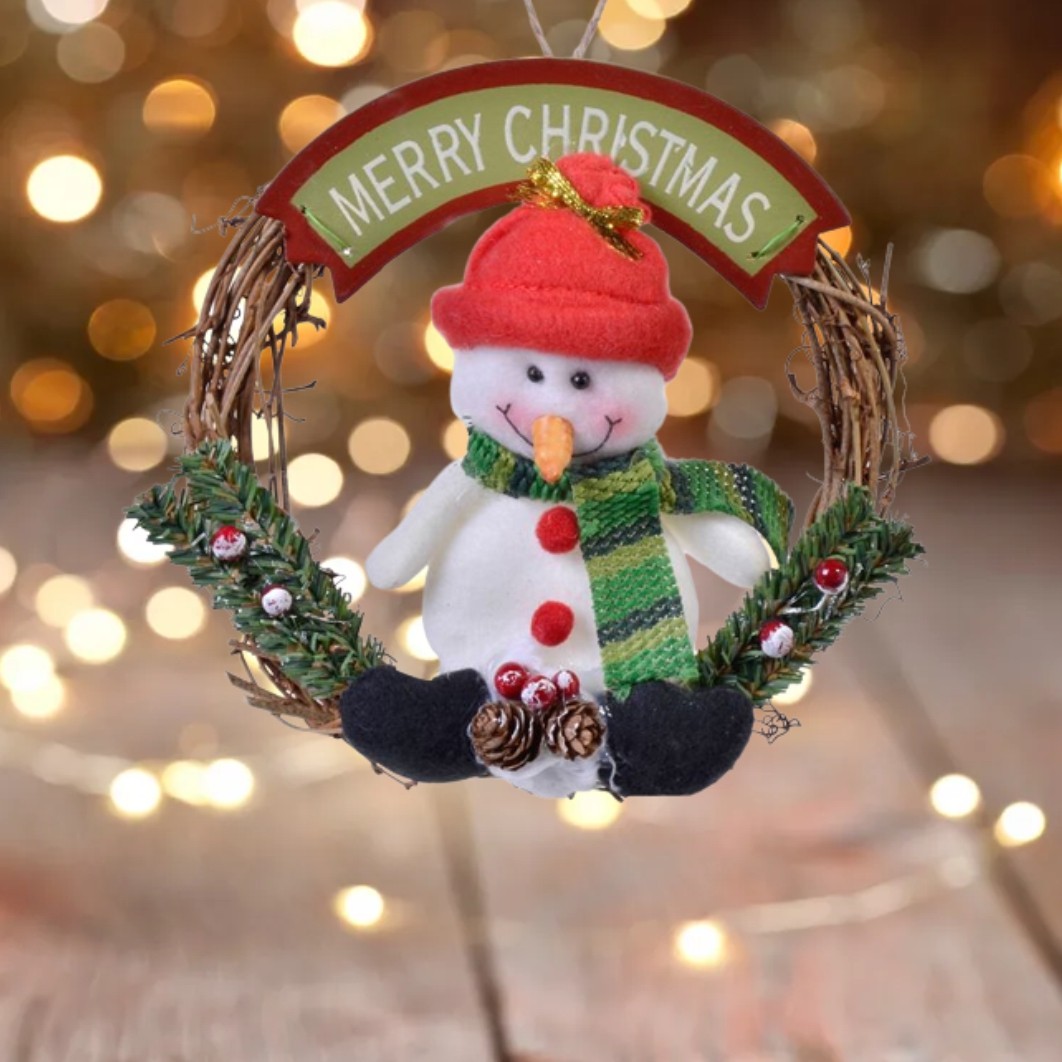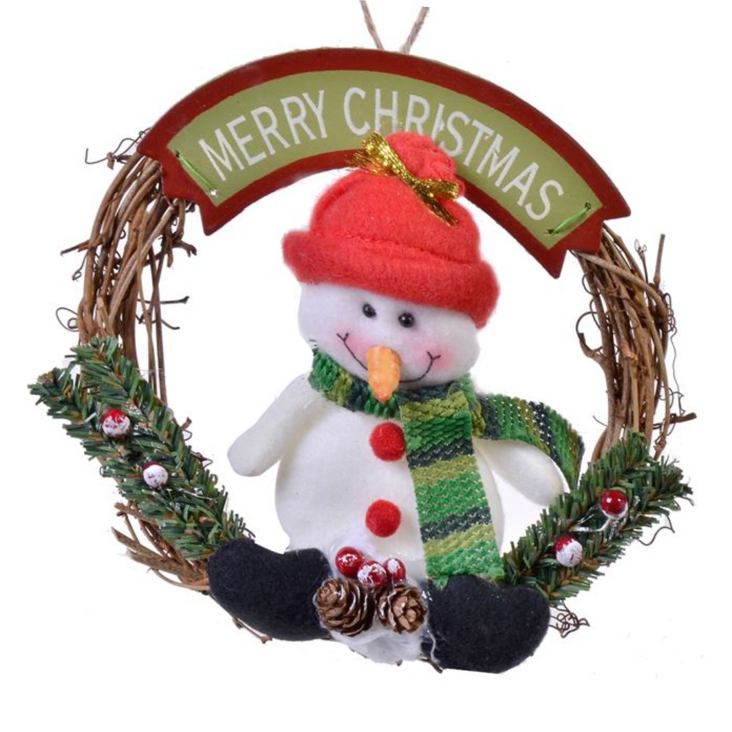 Decoratiune suspendabila decorativa din lemn coronita cu figura Om de Zapada cu fular si mesaj ”MERRY CHRISTMAS”. Decorati casa pentru sarbatorile de iarna.