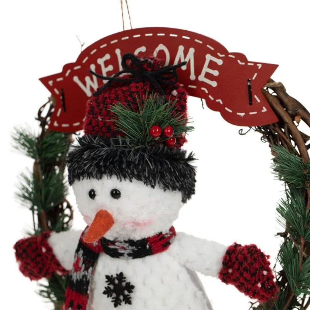 Coronita decorativa de Craciun, din lemn cu figurina alba de om de zapada cu caciula tricotata neagra-rosie, cu ace de pin si mesaj de bun venit.