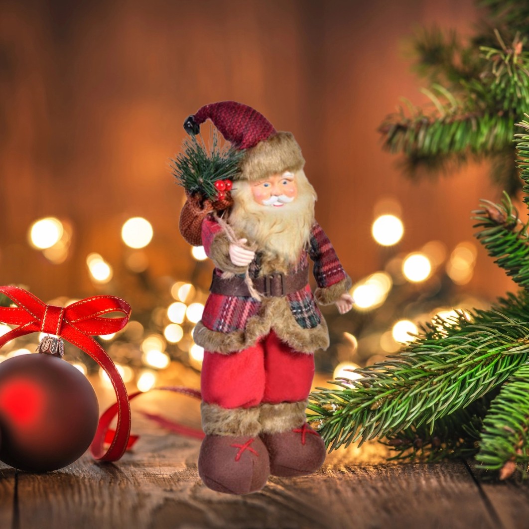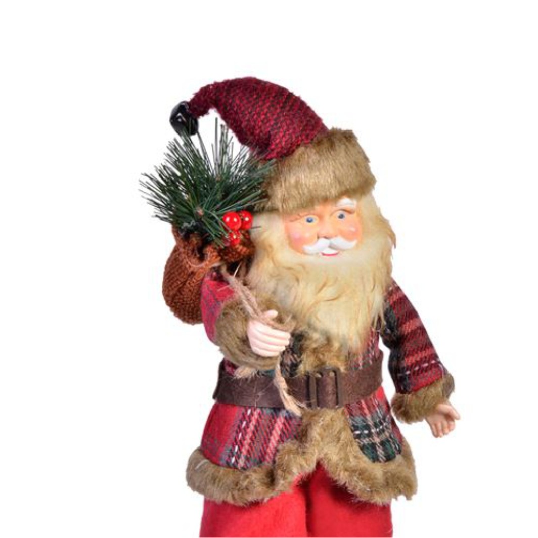 Figura decorativa Mos Craciun cu sacou cu carouri.