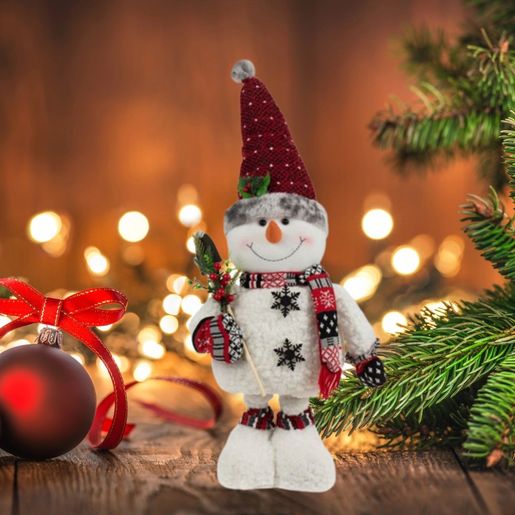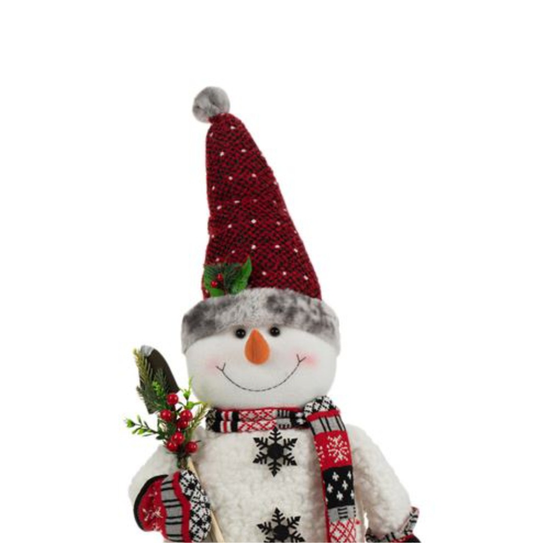 Figurina decorativa de Craciun, om de zapada de culoare alba, cu caciula rosie, fular rosu albastru, manusi si lopata din lemn cu fructe de padure. Are picioare telescopice care ii maresc inaltimea de la 92 la 122 cm.
