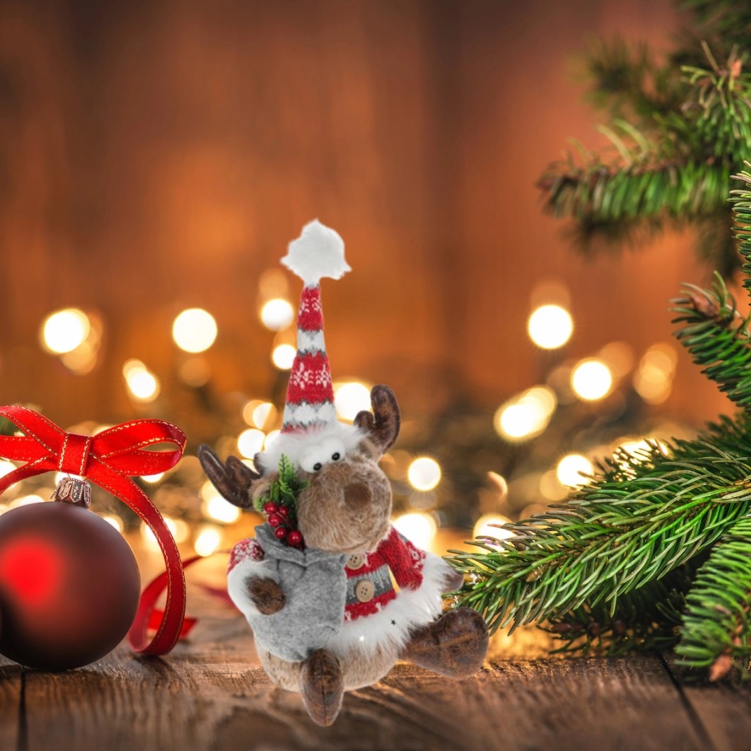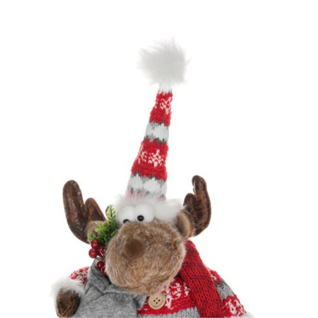 Figurina decorativa de Craciun, cerb asezat, cu blana maro, haina gri rosie cu nasturi din lemn, fular tricotat si caciula cu sac gri cu pomusoare rosii.