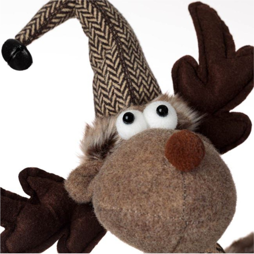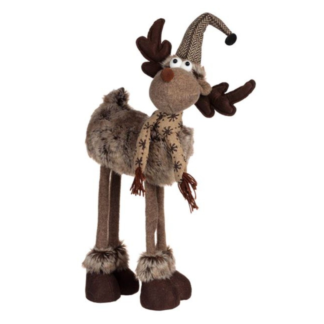 Figura decorativa de Craciun, cerb cu picioare inalte, corp maro, fular maro si caciula cu clopotel.