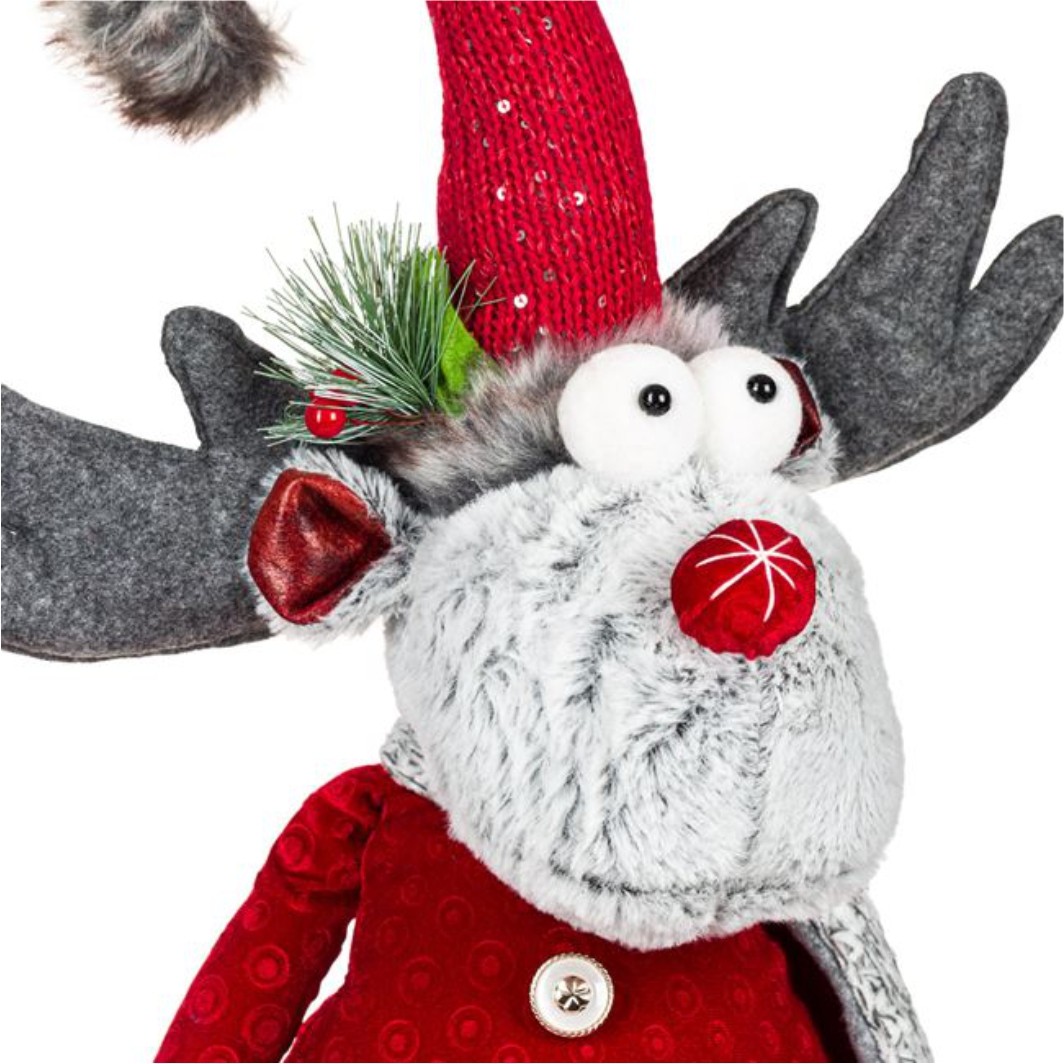 Figura decorativa de craciun, cerb cu corp gri, haina rosie, fular gri, caciula rosie cu paiete si picioare lungi.