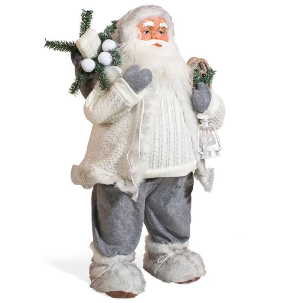 Figurina decorativa Mos Craciun cu haina alba si felinar.
