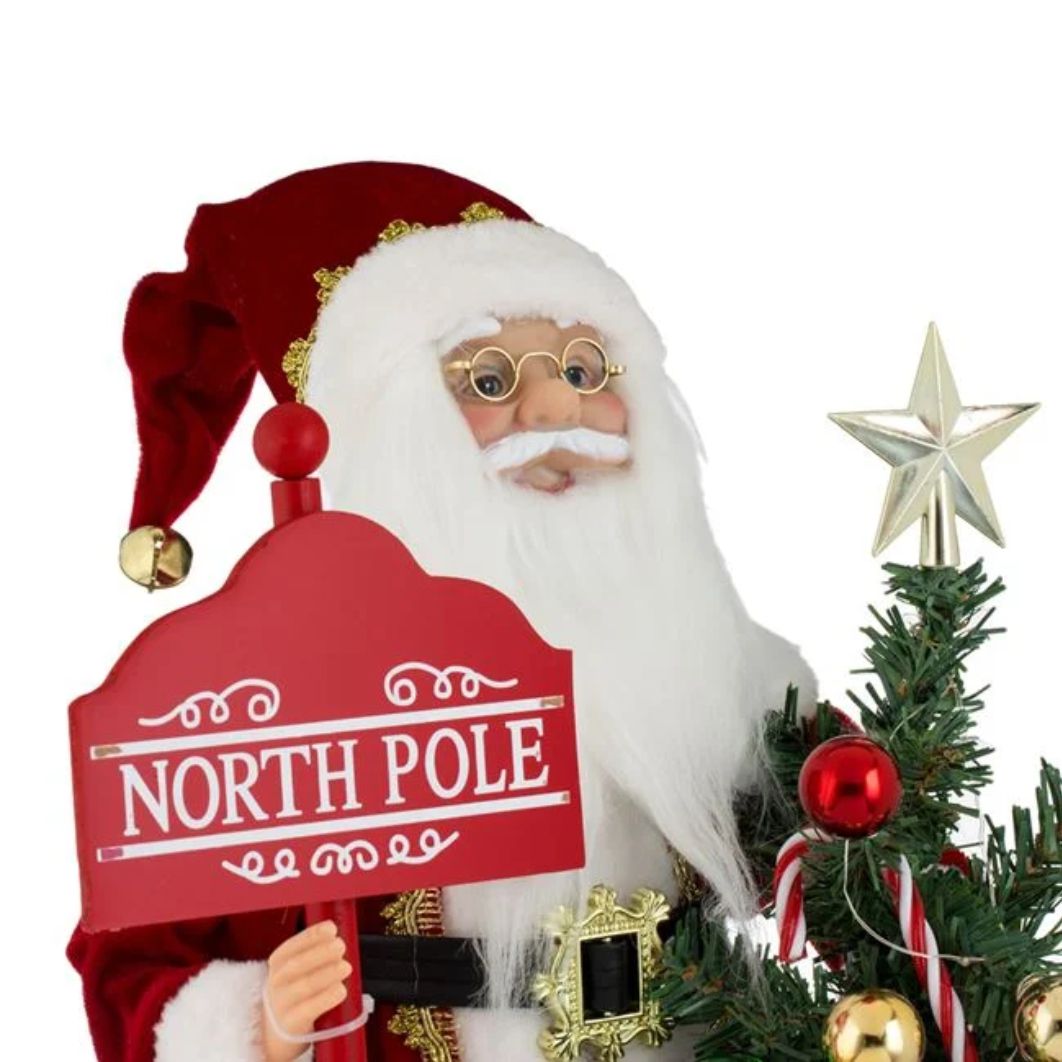 Figurina decorativa de Craciun realista, Mos Craciun cu sac plin de cadouri, tabela si lumini cu LED. Functioneaza cu 2 baterii CR2032 (incluse).