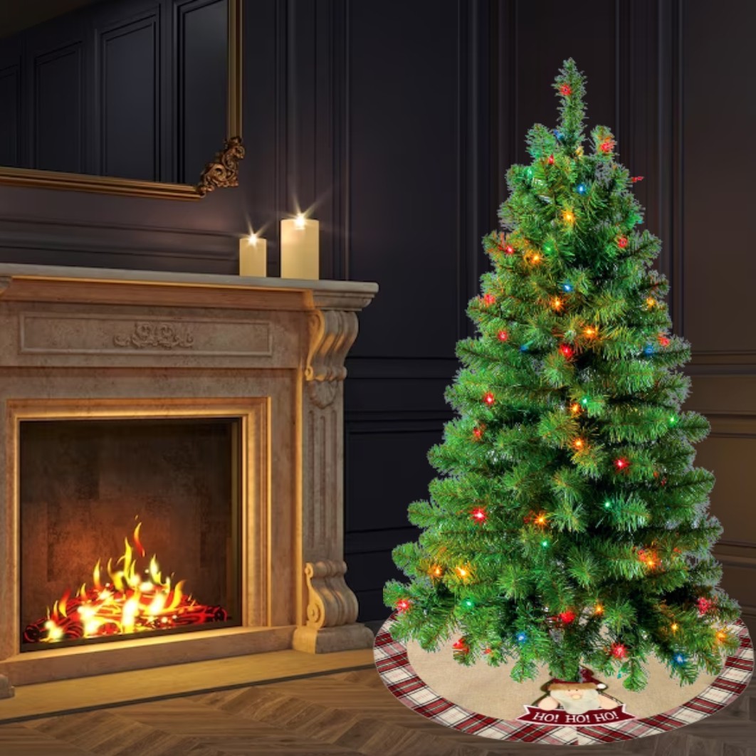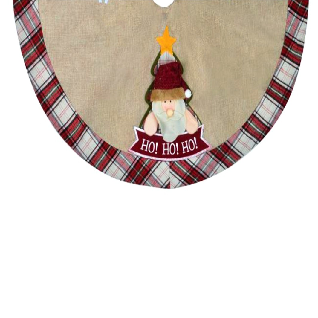 Fusta decorativa pentru brad, bej de in, cu carouri rosii si model Mos Craciun. Cu diametru de 92cm. Completeaza impodobirea bradului de craciun!