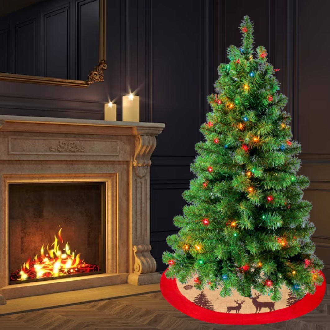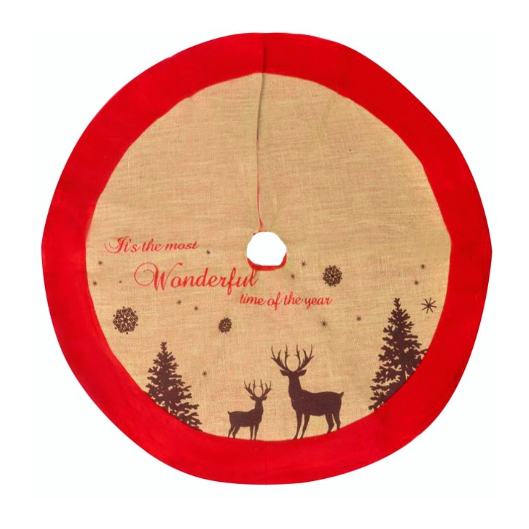 Fusta decorativa pentru brad, bej iuta cu margine rosie, model cerbi si mesaj „It’s the most wonderful time of the year”. Cu diametru de 102cm.