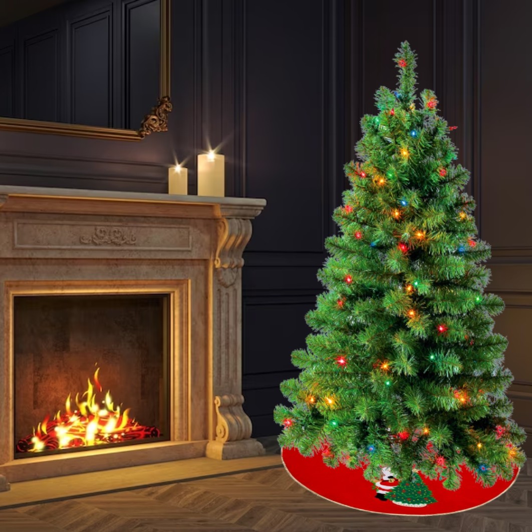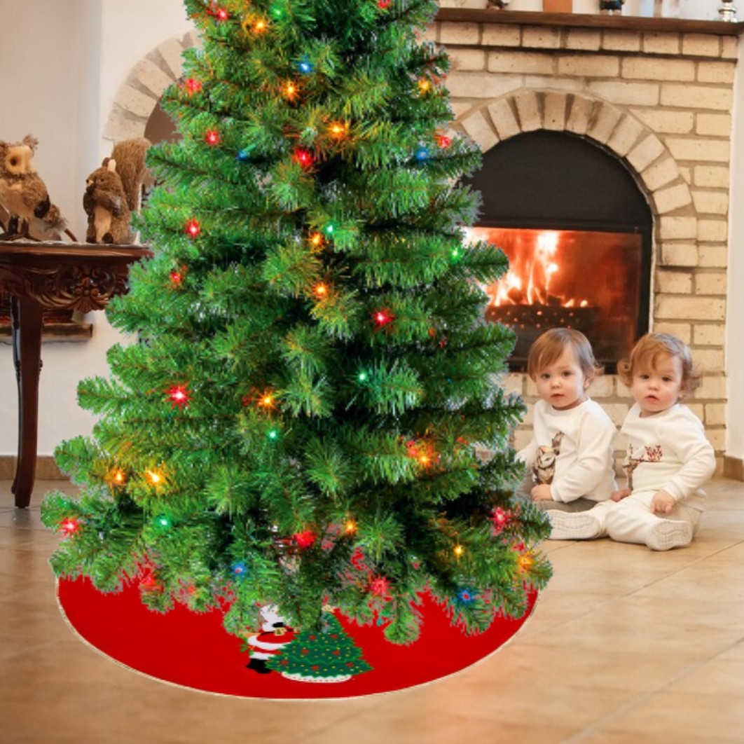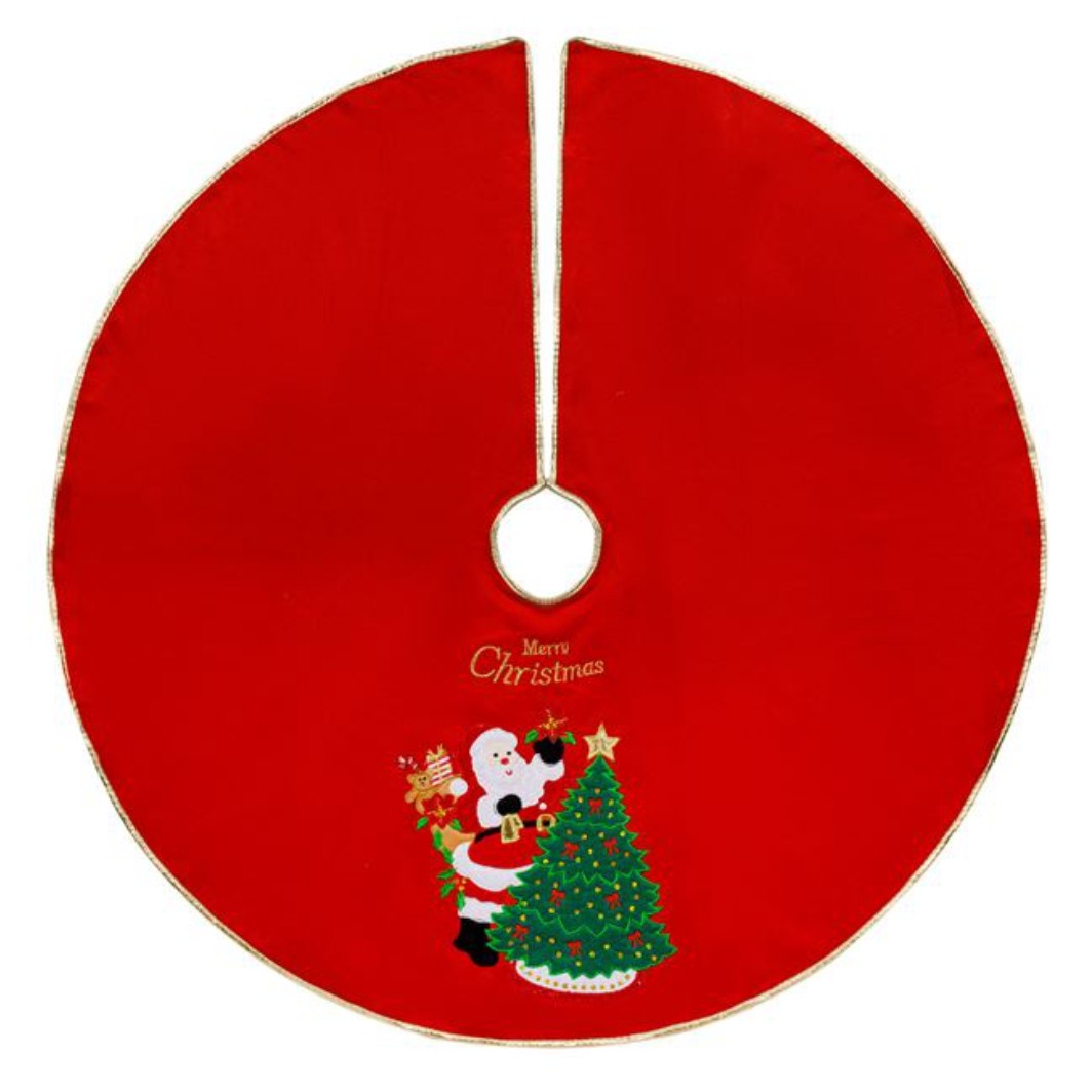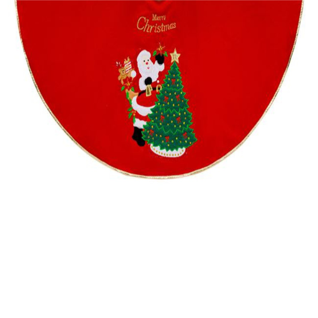 Fusta decorativa pentru brad, de pasla rosie cu model Mos Craciun, brad, cadouri si margine aurie. Cu diametru de 1m. Completeaza impodobirea bradului de craciun!