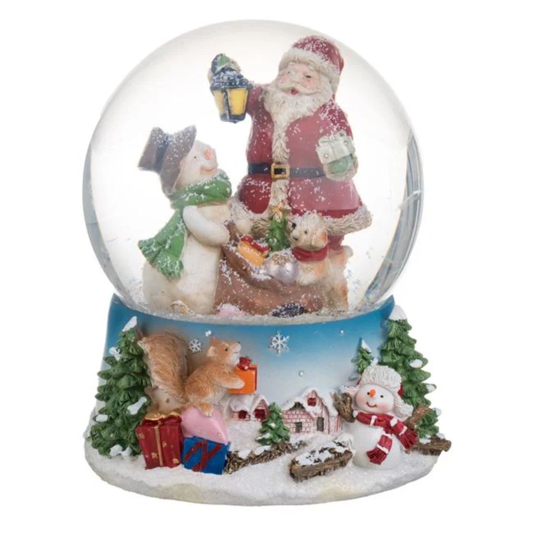Glob de zapada de Craciun, cu figura lui Mos Craciun si om de zapada langa sac cu cadouri si baza sculptata ninsa cu detalii sculptate. Functioneaza cu 3 baterii AA (nu sunt incluse).
