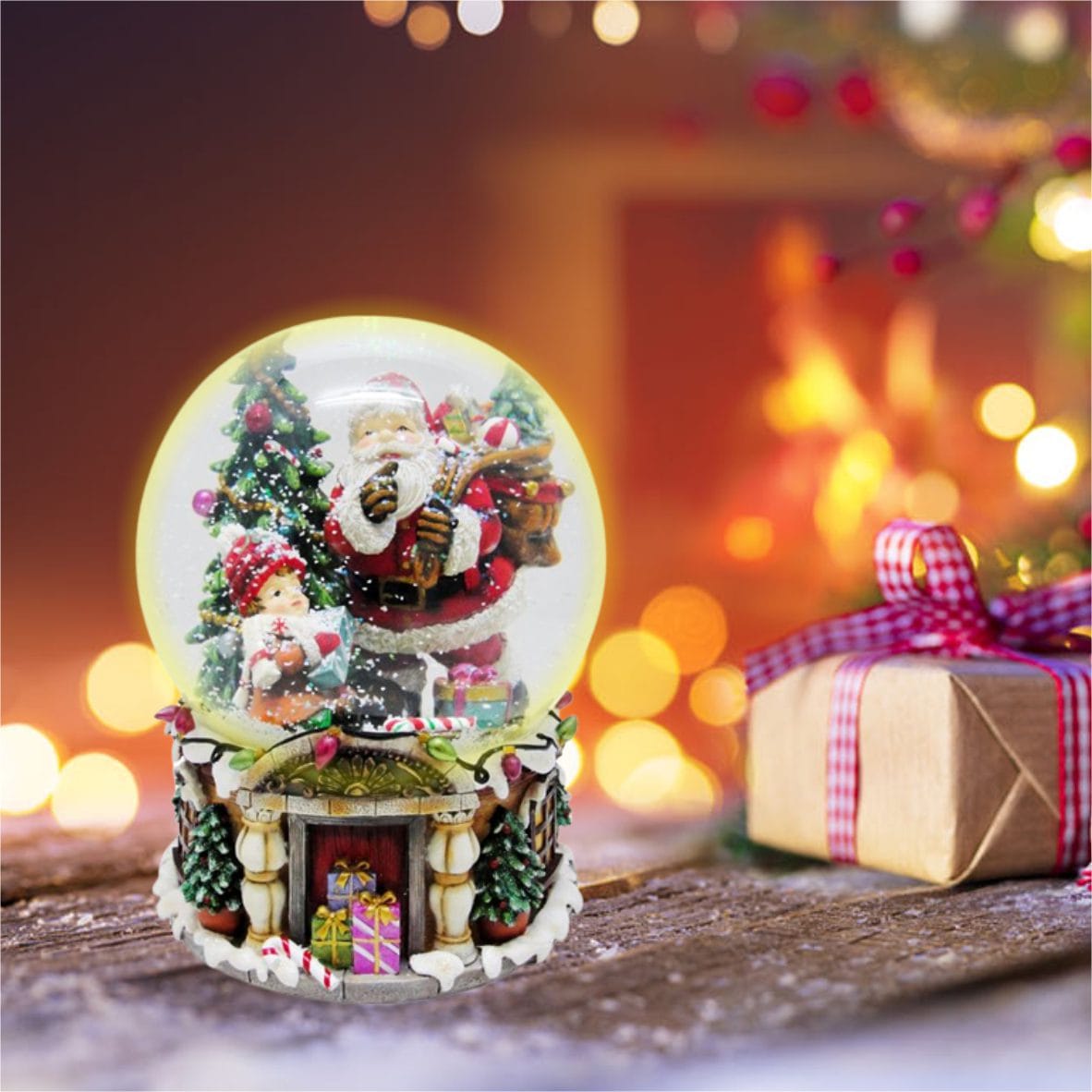 Muzica de Craciun intr-un bulgare de zapada, Mos Craciun pe drum inzapezit inconjurat de un copil, un brad pe o baza cu semineu sculptat.