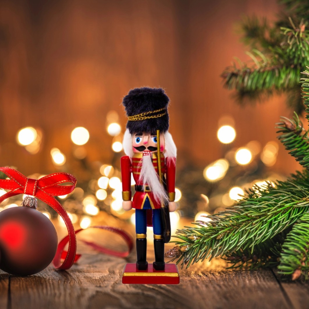 Decoratiune de Craciun, din seria soldati din lemn, soldat suspendabil cu uniforma rosie/albastra si caciula neagra de blana