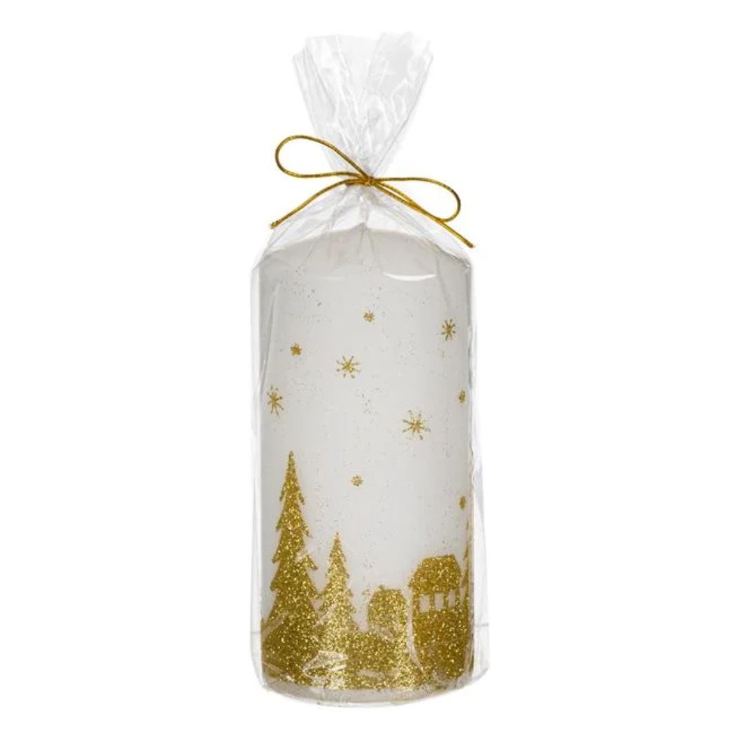 Lumanare decorativa de Craciun, alba cu model brazi cu glitter auriu si fulgi.