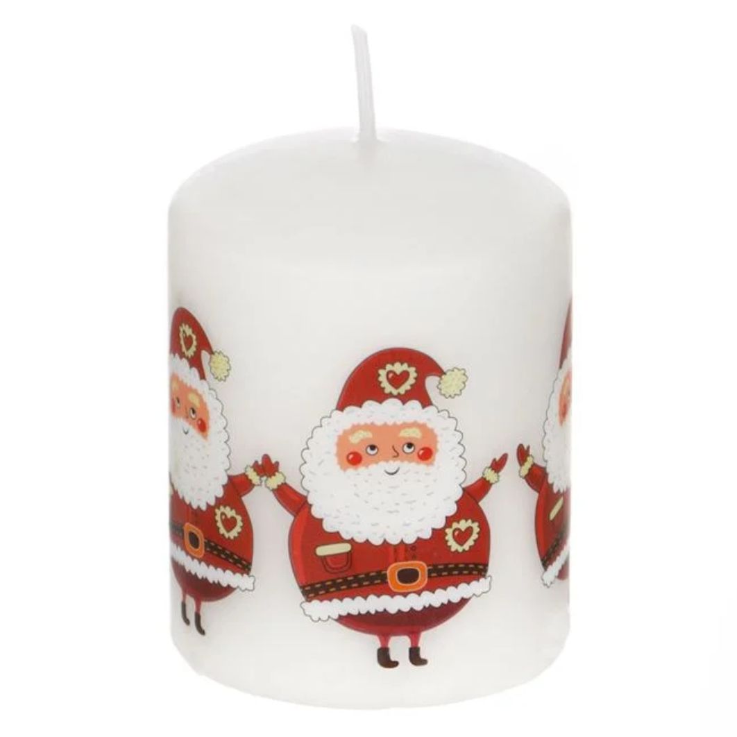 Lumanare decorativa de Craciun, alba cu figuri Mos Craciun.