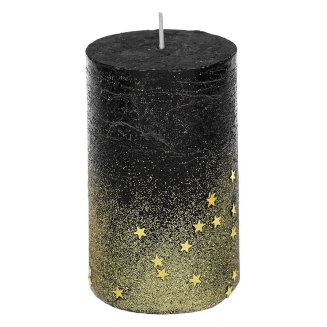 Lumanare decorativa de Craciun, de culoare neagra cu glitter auriu de la mijloc in jos si stelute.