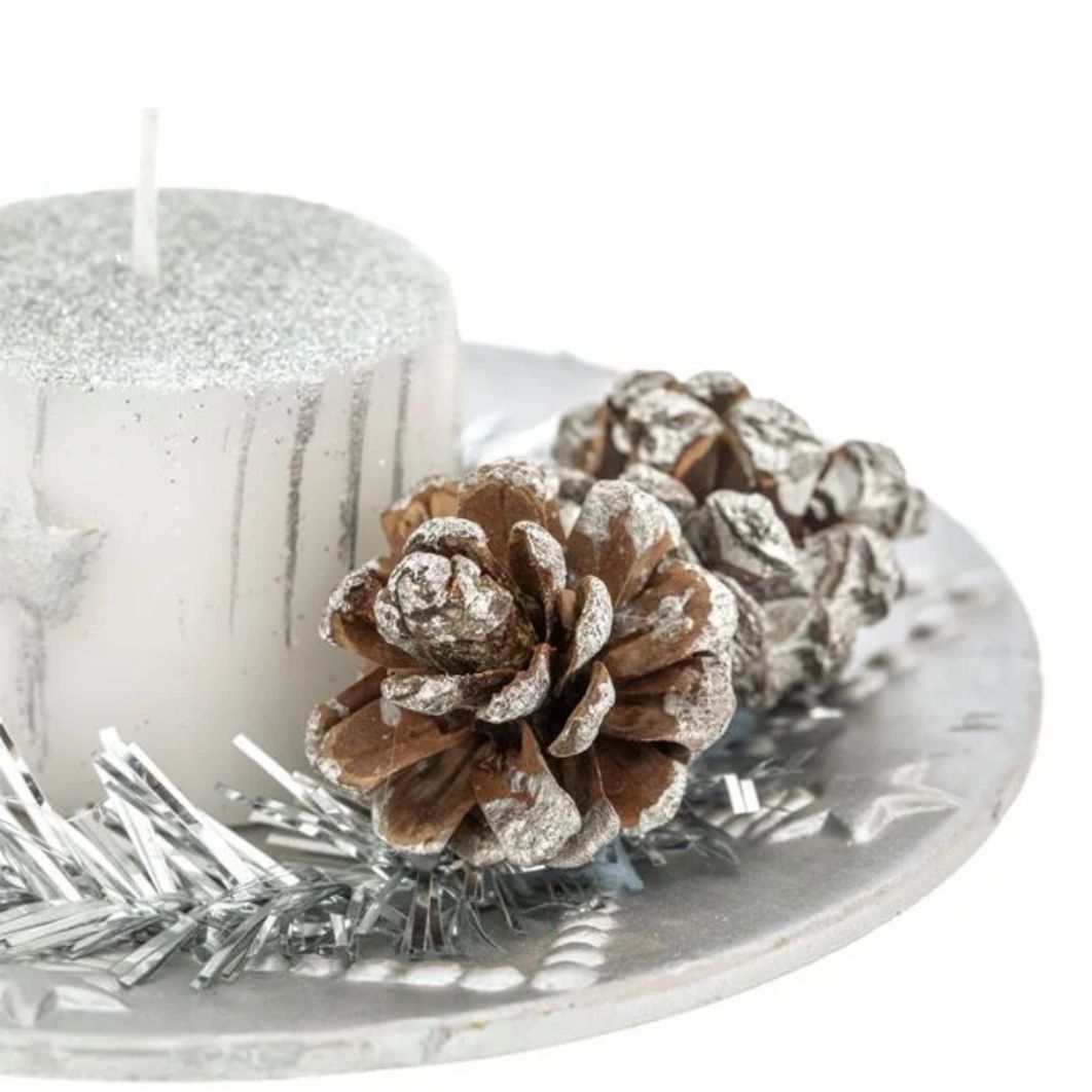 Decoratiune de Craciun, Lumanare, Platou Decorativ, Conuri, Argintiu, 14cm, DCJ313