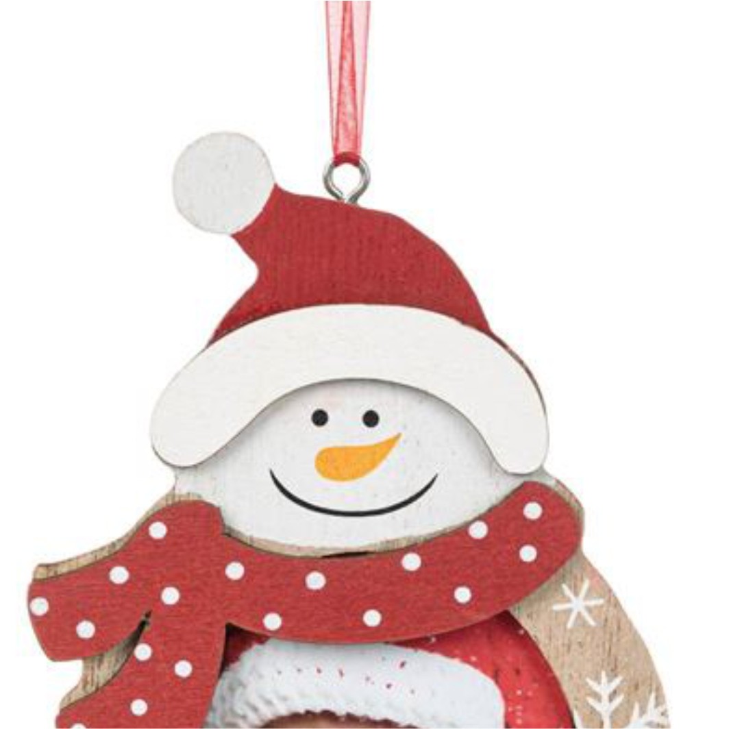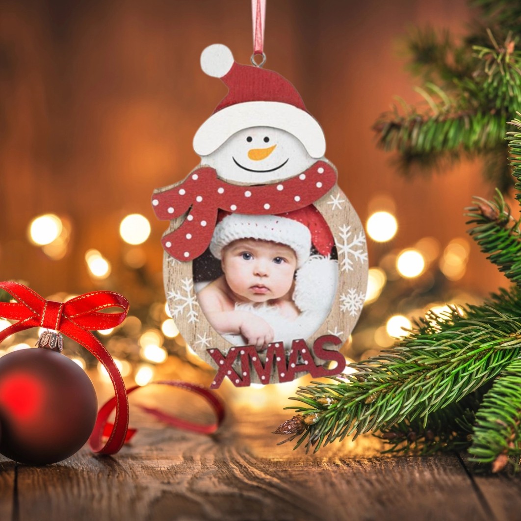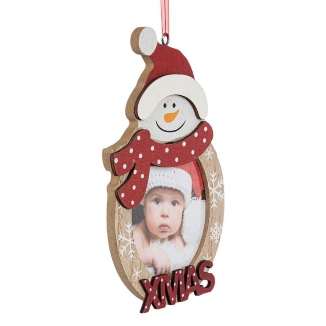 Ornament pentru bradul de Craciun, din lemn, cu model de om de zapada, literele XMAS si un loc de (7x8cm) unde puteti pune fotografia dvs. si il faceti unic.