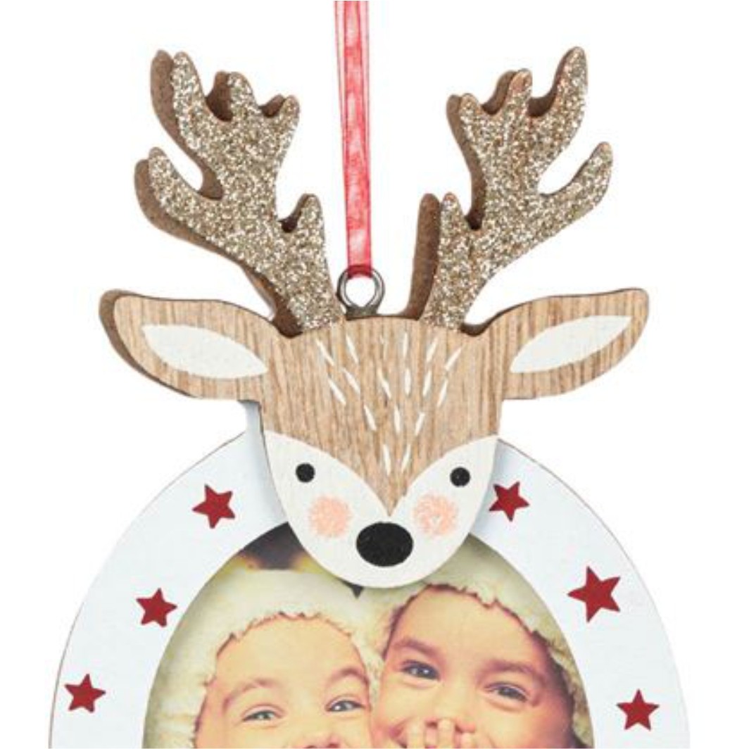 Ornament pentru bradul de Craciun, din lemn, cu model de ren, cu sclipici de culoarea sampaniei pe cornite si un loc (7x8cm) unde puteti pune fotografia dvs. si o faceti unica.