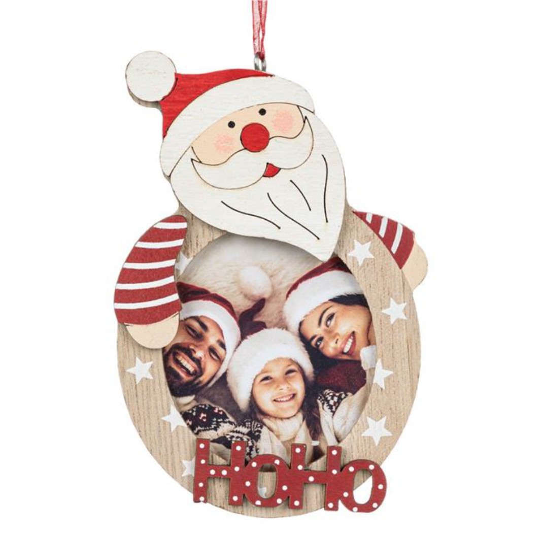 Ornament pentru bradul de Craciun, din lemn, cu model Mos Craciun, literele Ho Ho si un loc de (7x8cm) unde puteti pune fotografia dvs. si o faceti unica.