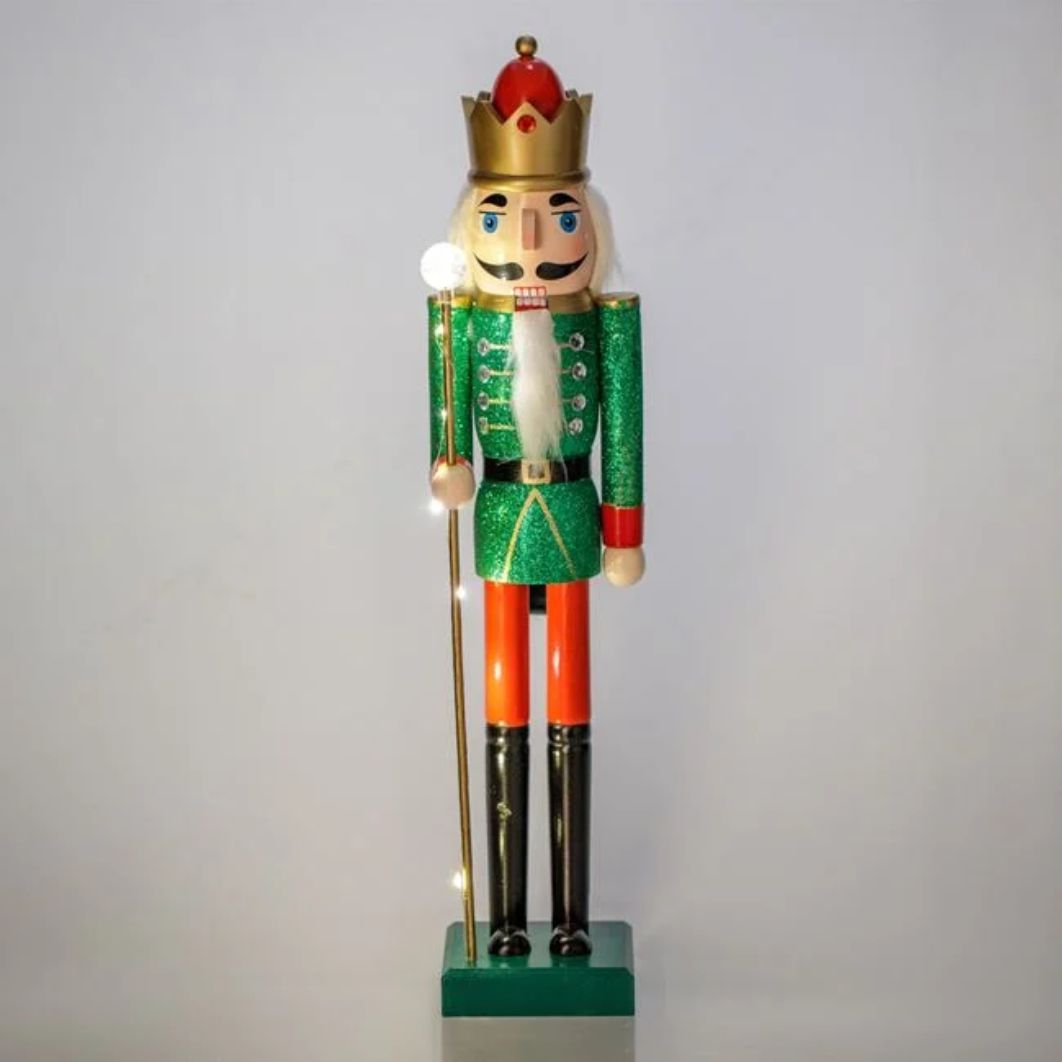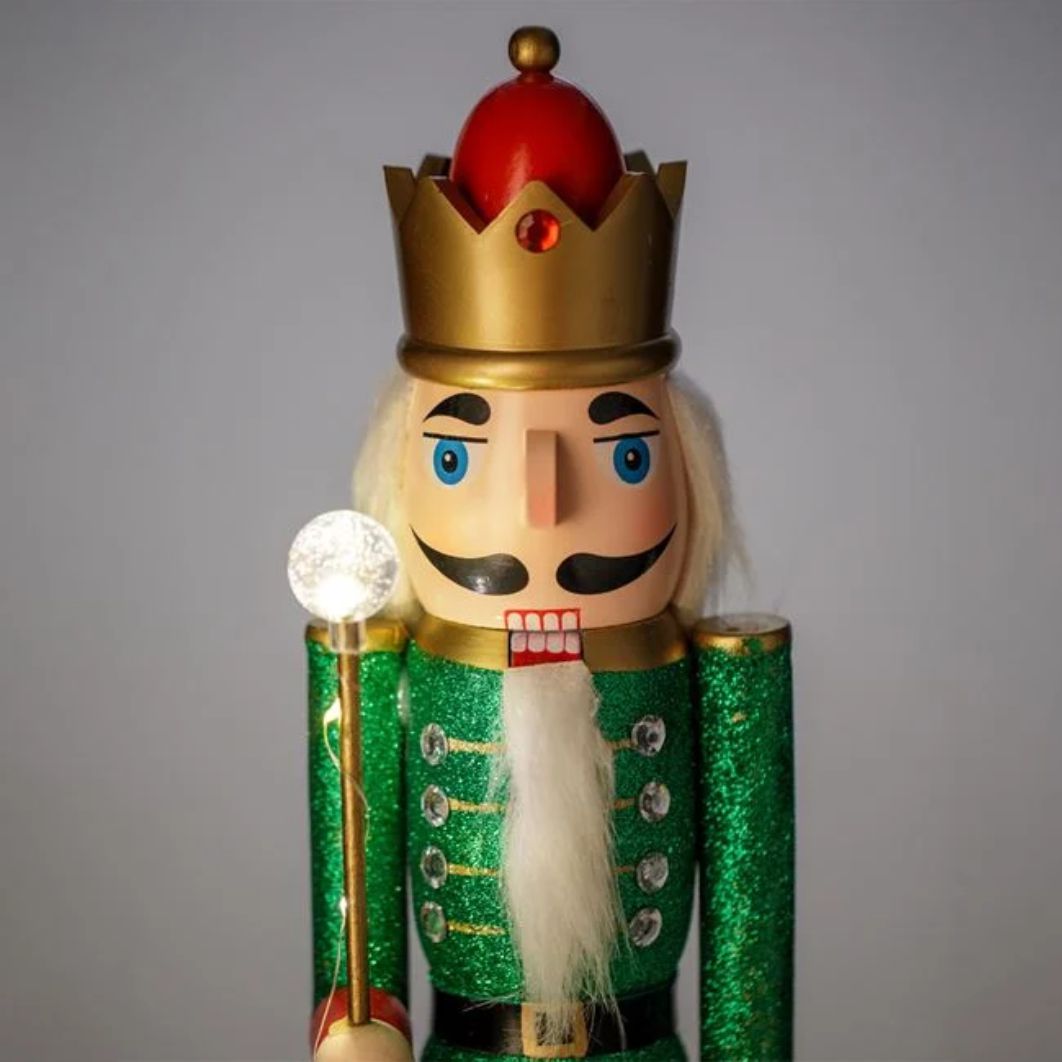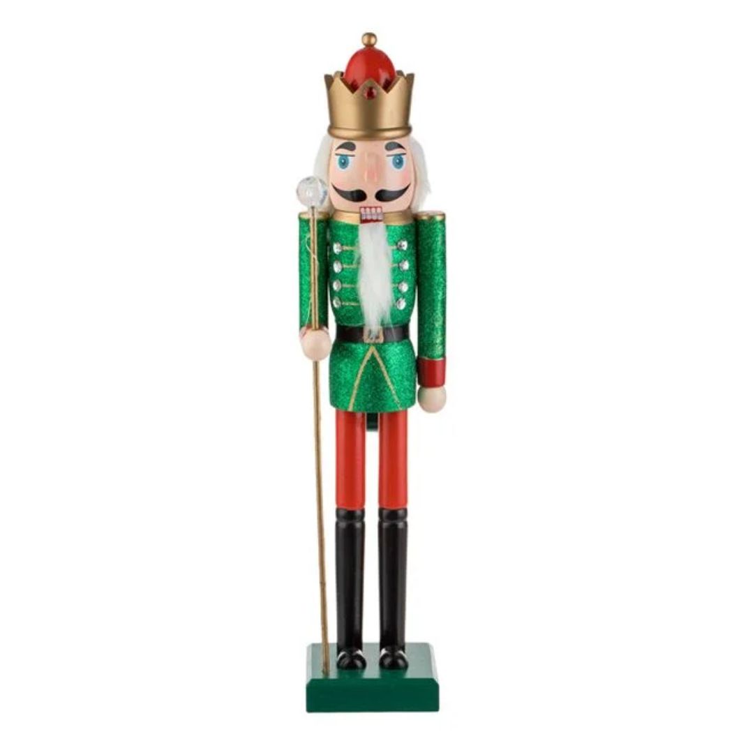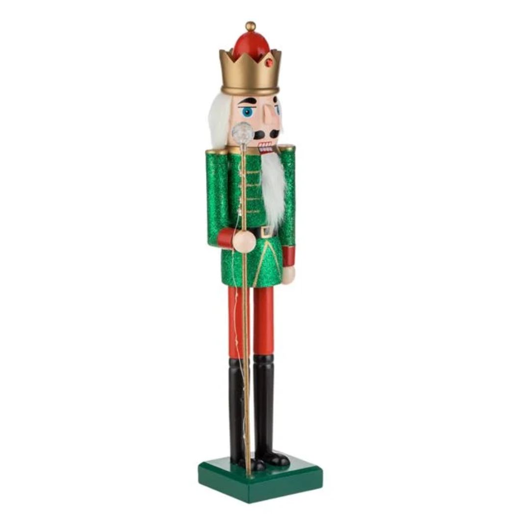 Decoratiune de Craciun, din seria soldati din lemn, rege cu uniforma verde cu glitter si margele. El tine un sceptru cu LED. Functioneaza cu 2 baterii AA (nu sunt incluse).