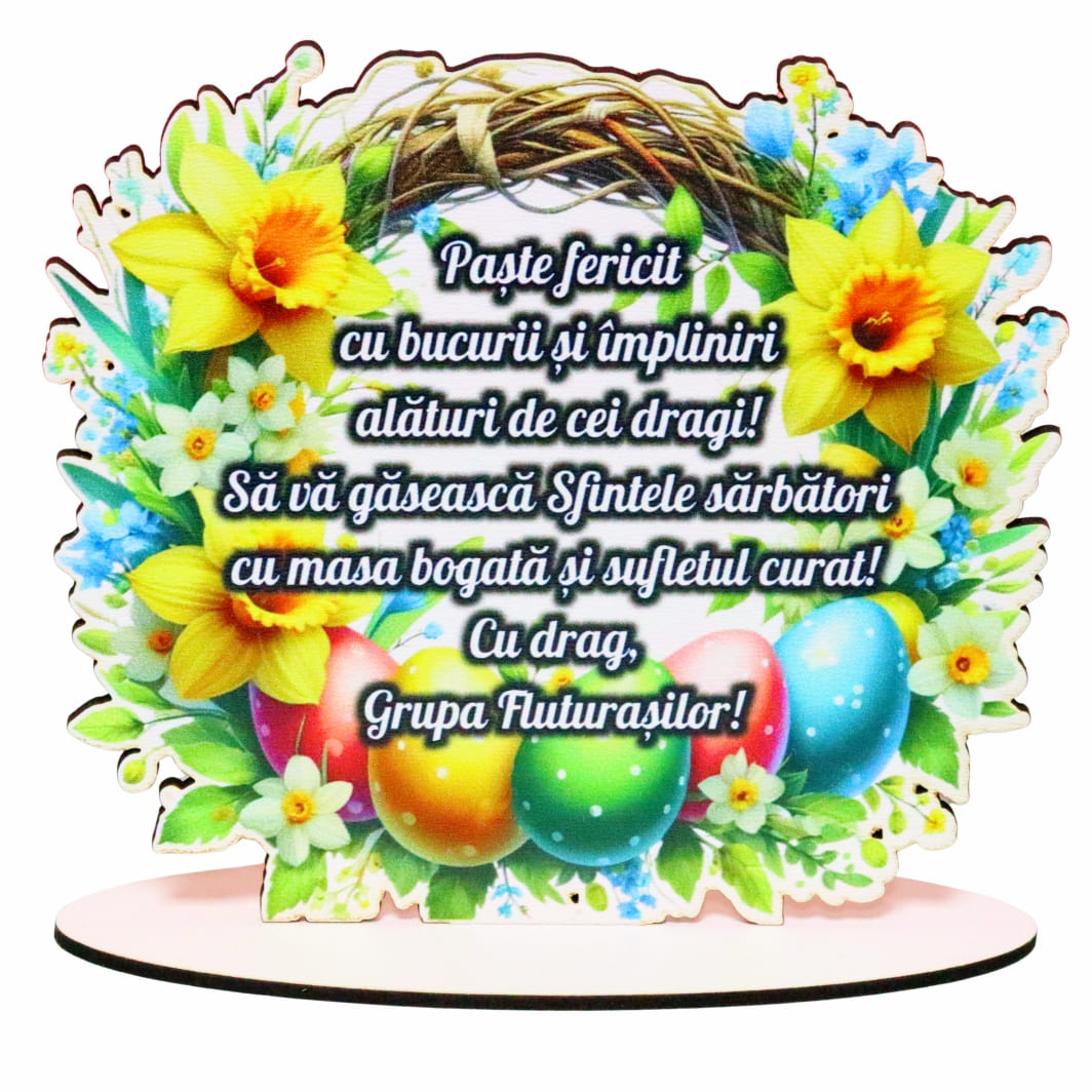 Dimensiunile acestei decoratiune educatoare paste sunt de 15×14 cm, ceea ce o face potrivită pentru a fi așezată pe birou, raft sau pe masa festivă. Designul inspirat din frumusețea primăverii include o coroană decorativă bogată, formată din flori galbene de narcise, flori albe delicate și ouă pascale multicolore. Aceste elemente simbolizează renașterea, bucuria și speranța, fiind perfect integrate în mesajul personalizat dedicat grupei Fluturașilor.