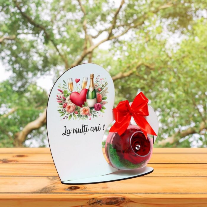 Construit din lemn durabil și finisat cu atenție, suportul beneficiază de culori vibrante datorită printului UV rezistent în timp. Lichenii verzi adaugă prospețime și naturalete, completând perfect intensitatea trandafirului criogenat roșu. Împreună, aceste elemente formează o piesă decorativă rafinată, ideală pentru aniversări, 1 Martie, 8 Martie, sărbători sau zile în care doriți să transmiteți apreciere și afecțiune.