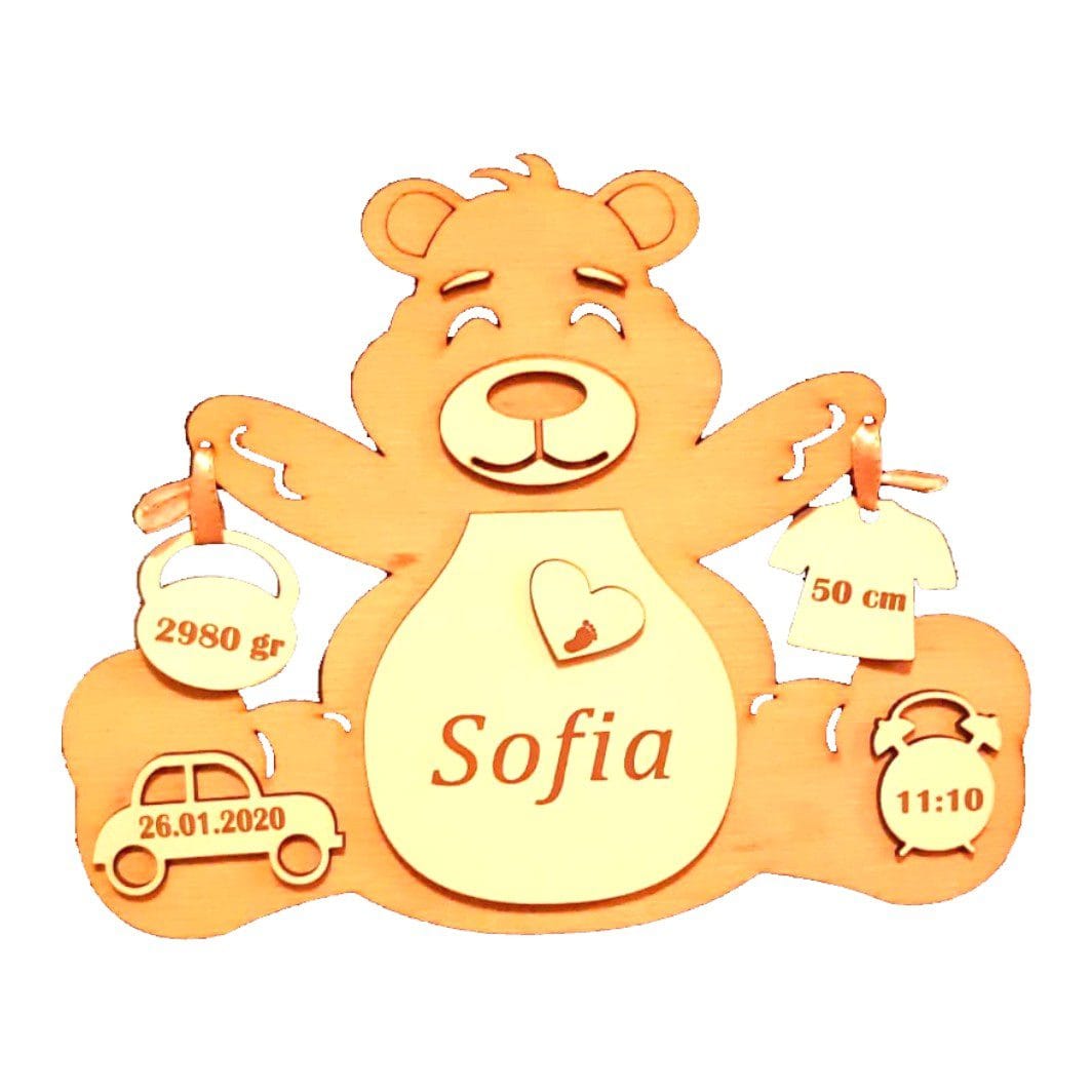 Decoratiune tip ursuler din lemn, personalizata cu datele nasterii copilului.
