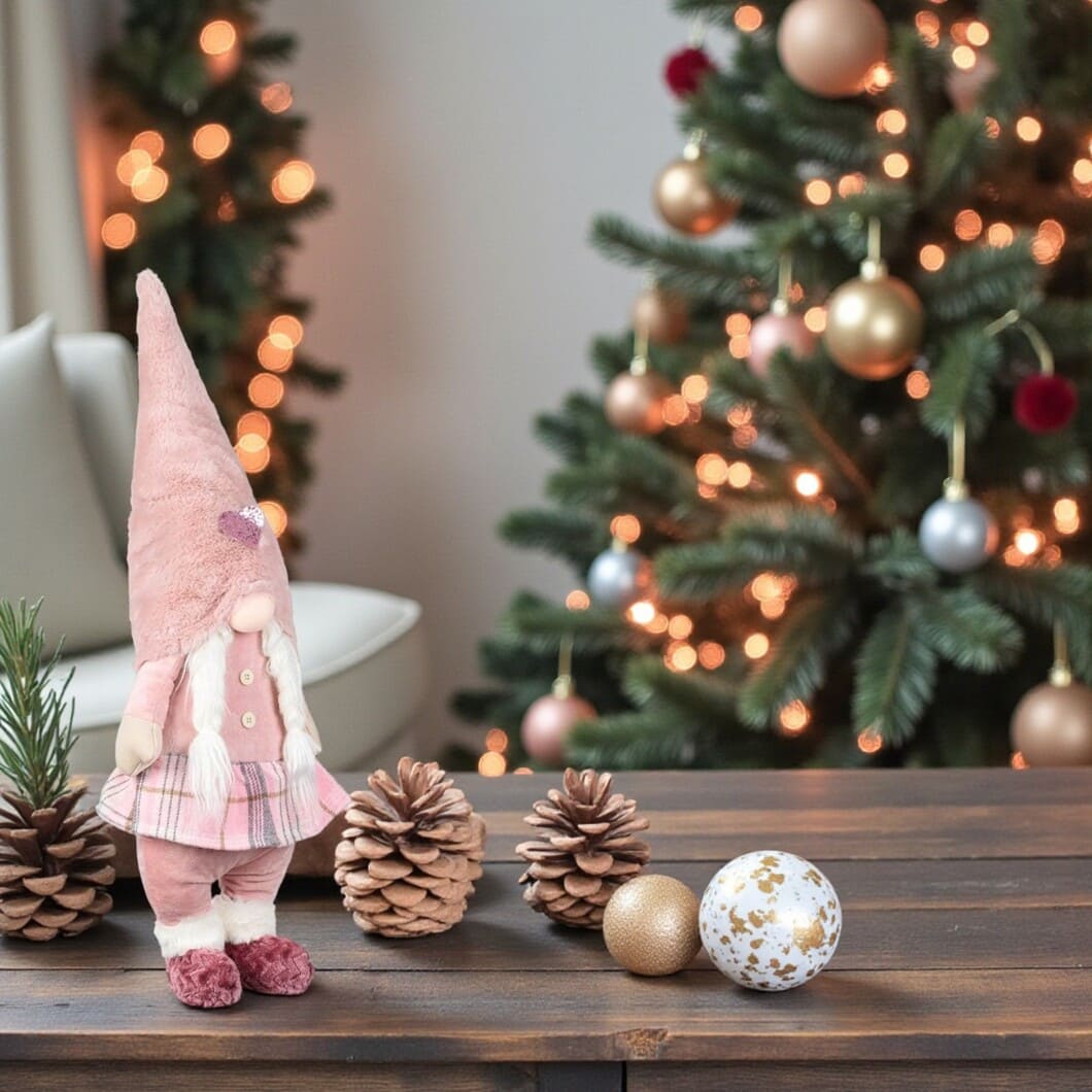 Poți integra cu ușurință gnomul în aranjamente cu brazi decorativi, lumânări, instalații luminoase, coronițe sau mini-scene tematice. Este o piesă care se potrivește atât unui decor minimalist, cât și unuia plin de culoare și accesorii tradiționale.