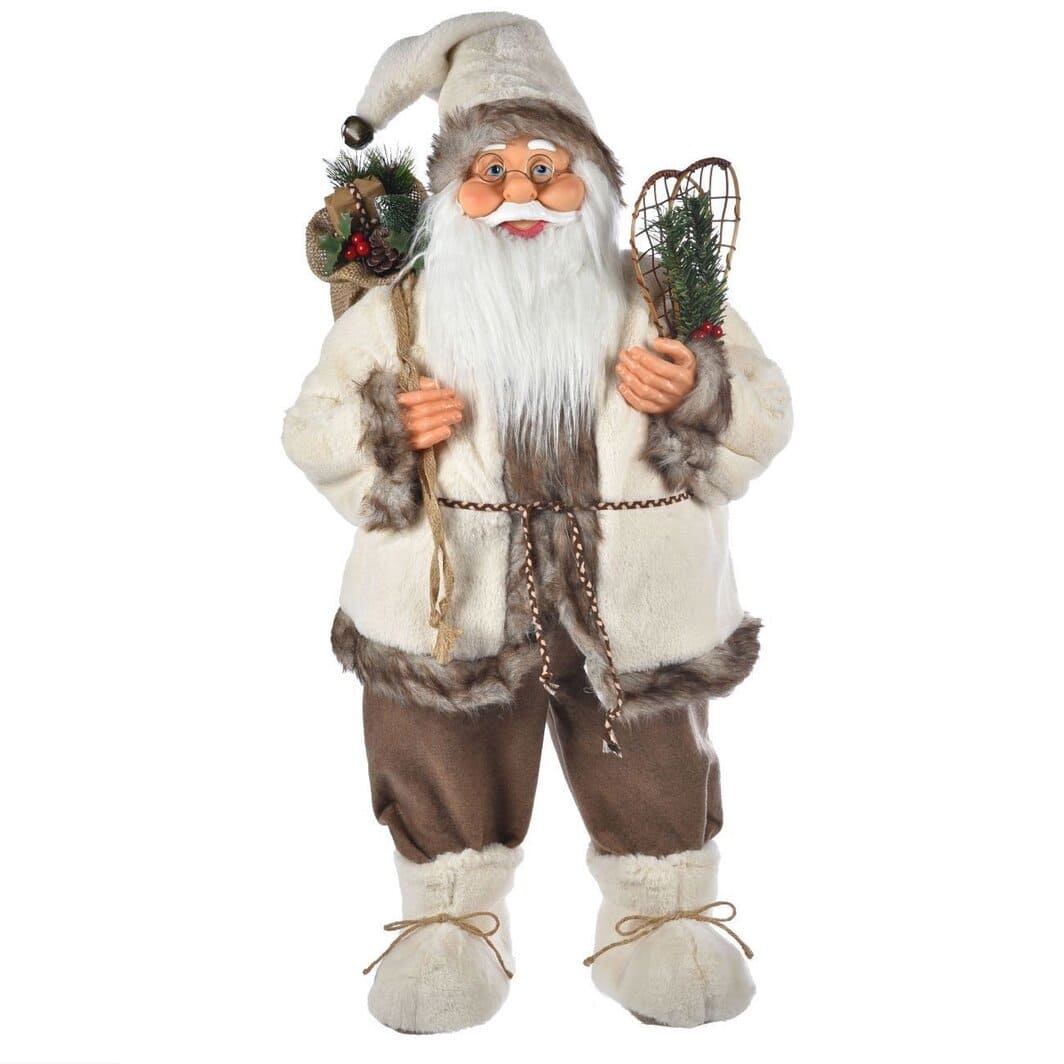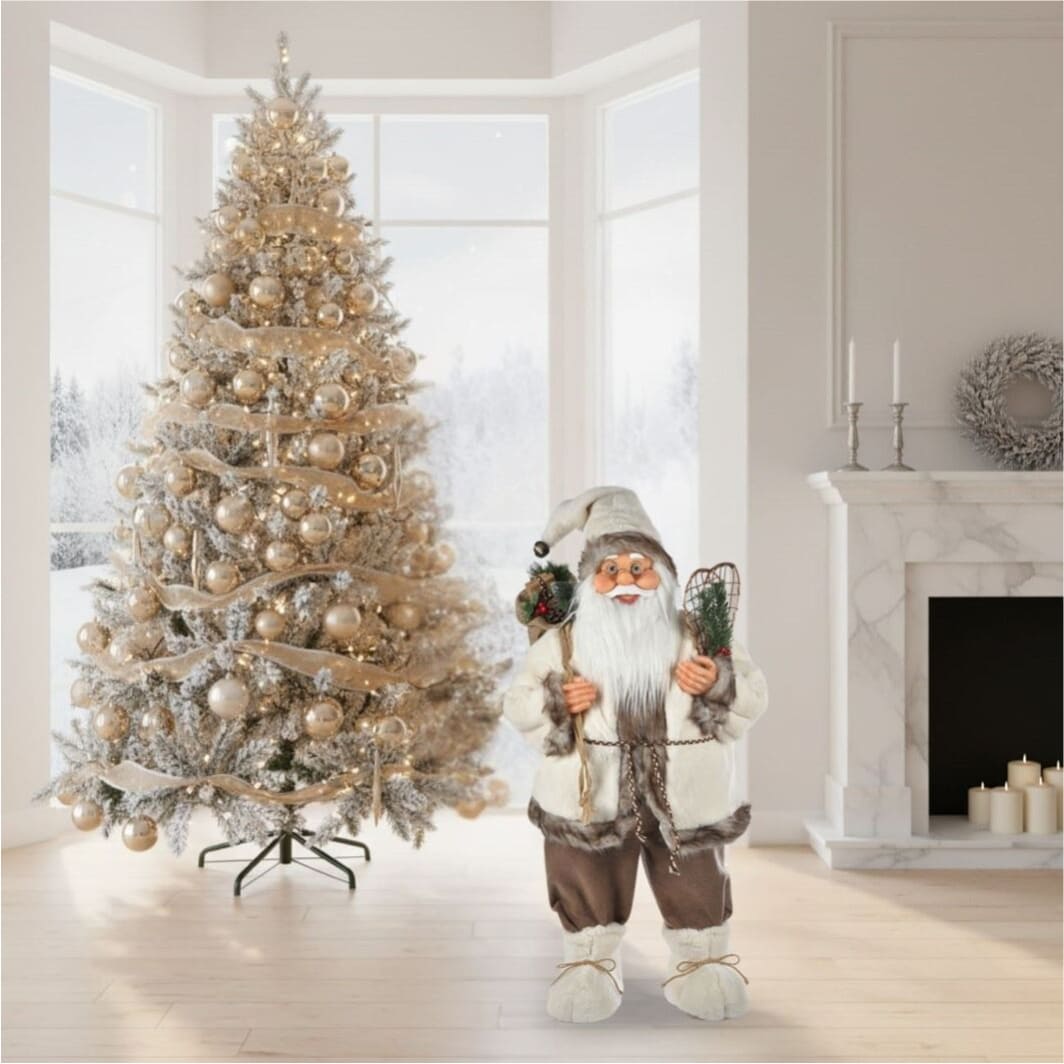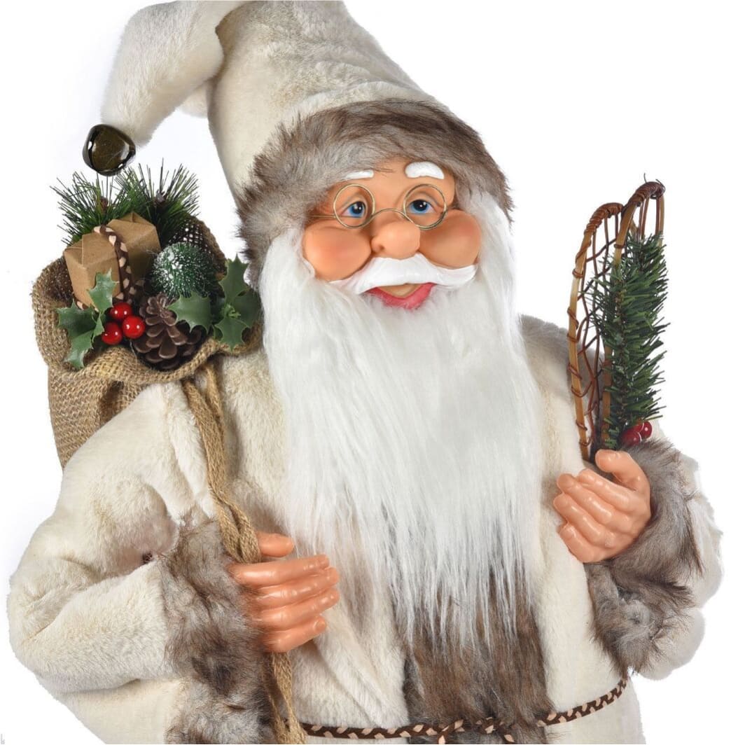 Figurina Mos Craciun – Model Haina Bej cu Sac si Schi, 80 cm (DCJ588)