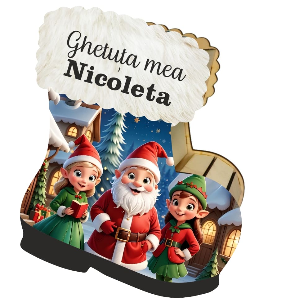 Placajul din plop oferă o textură naturală, plăcută și rezistentă, iar printul UV asigură culori vii și o suprafață lucioasă care nu se estompează în timp. Ghetuța este ușoară, stabilă și ușor de poziționat pe masă, sub brad sau lângă cizmulițele copiilor.