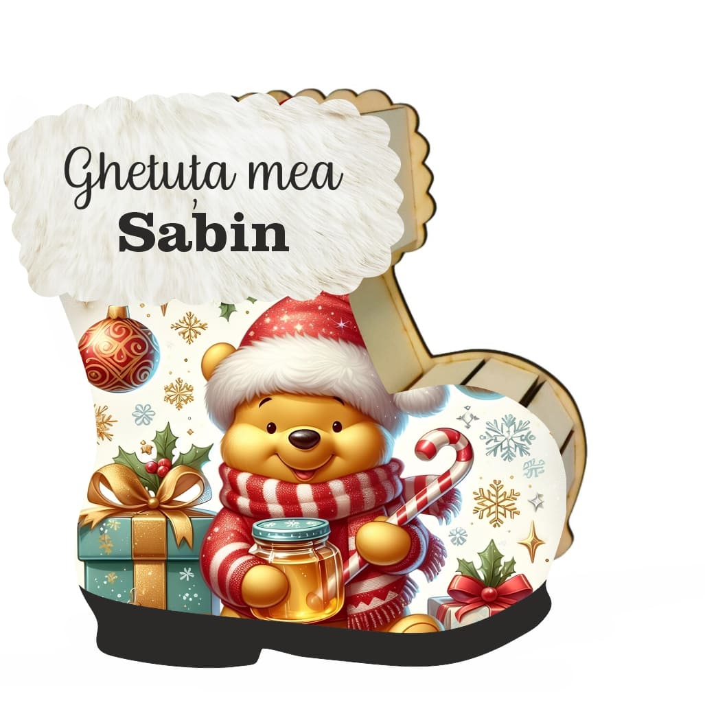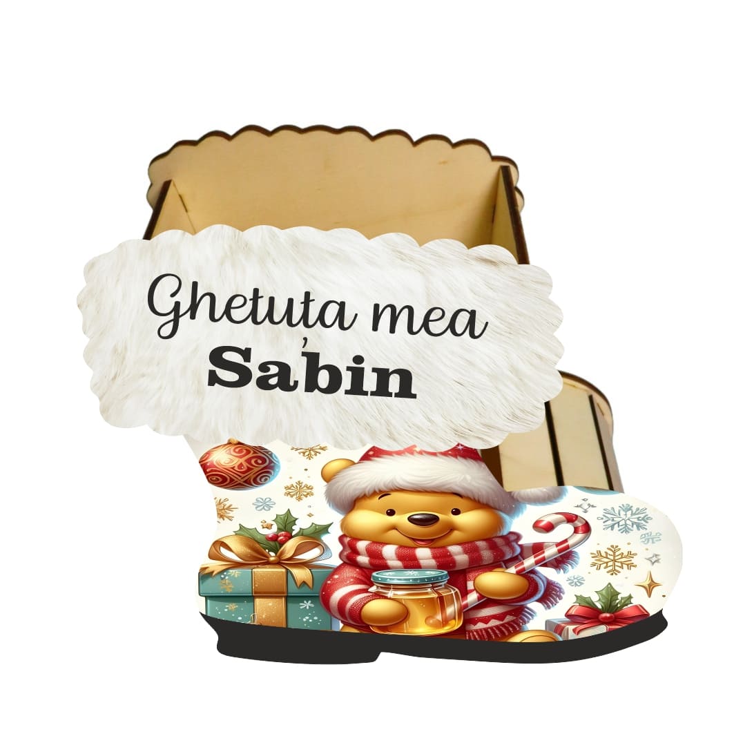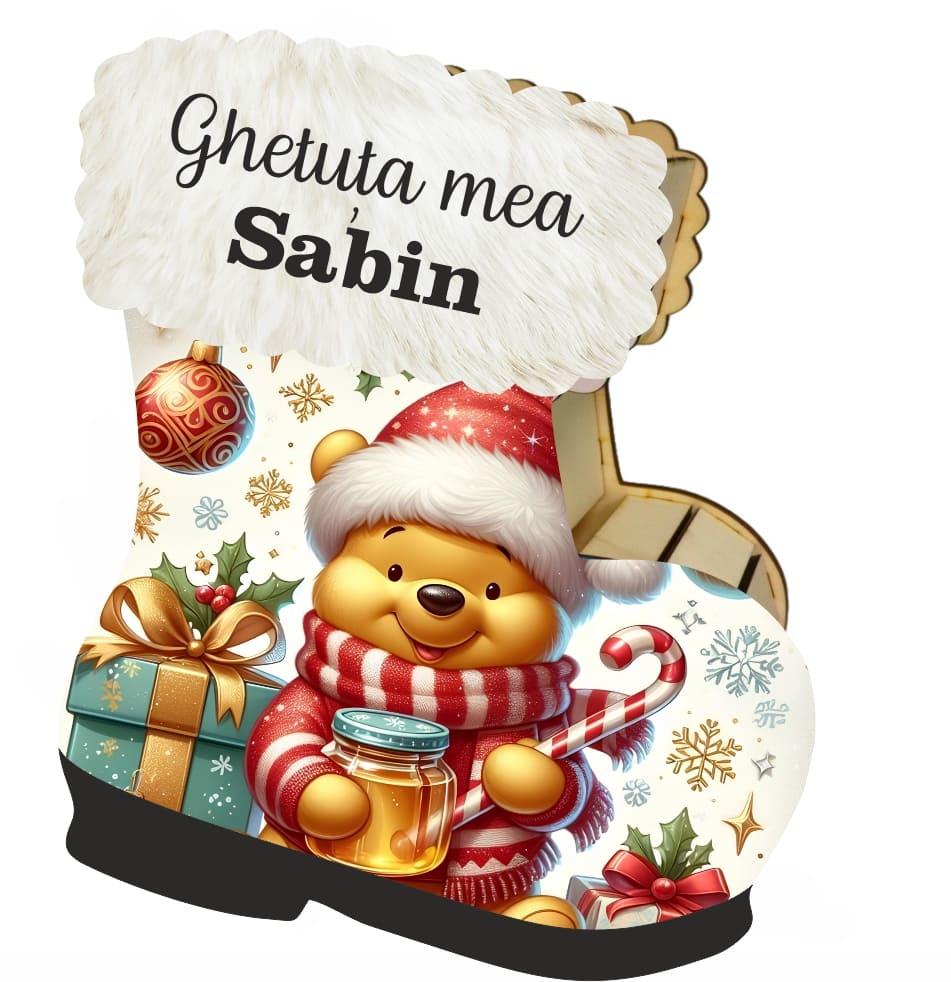 Crăciunul și Moș Nicolae vin cu emoție, bucurie și cadouri dulci! O ghetuță dulciuri realizată din lemn natural, cu un design adorabil și personalizare unică, este alegerea ideală pentru a aduce zâmbete copiilor. Modelul Winnie, Craciun transformă farmecul sărbătorilor de iarnă într-un cadou original și plin de culoare.