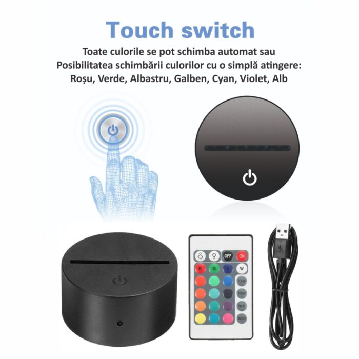 - Comutator tactil: Atinge baza lămpii pentru a schimba culoarea manual. Poți selecta 7 culori fixe sau 2 moduri dinamice (gradient sau stroboscopic).