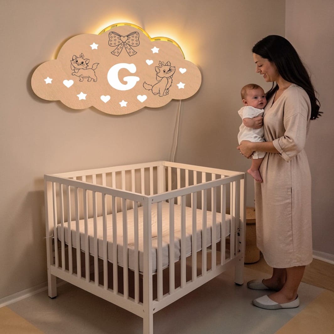 Lampa de veghe in forma de norisor, personalizata cu numele copilului.