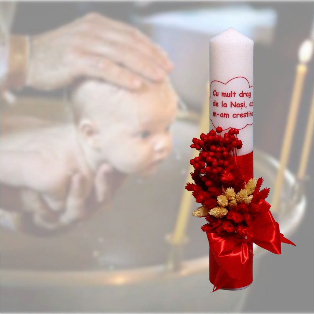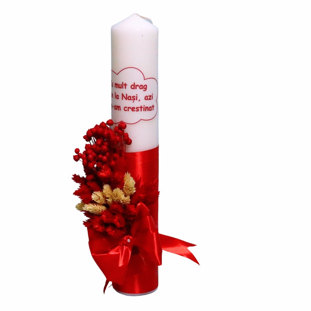 Lumanare Botez, Cu mesaj pentru nasi, Rosu, Flori uscate, 35 cm, LMB061