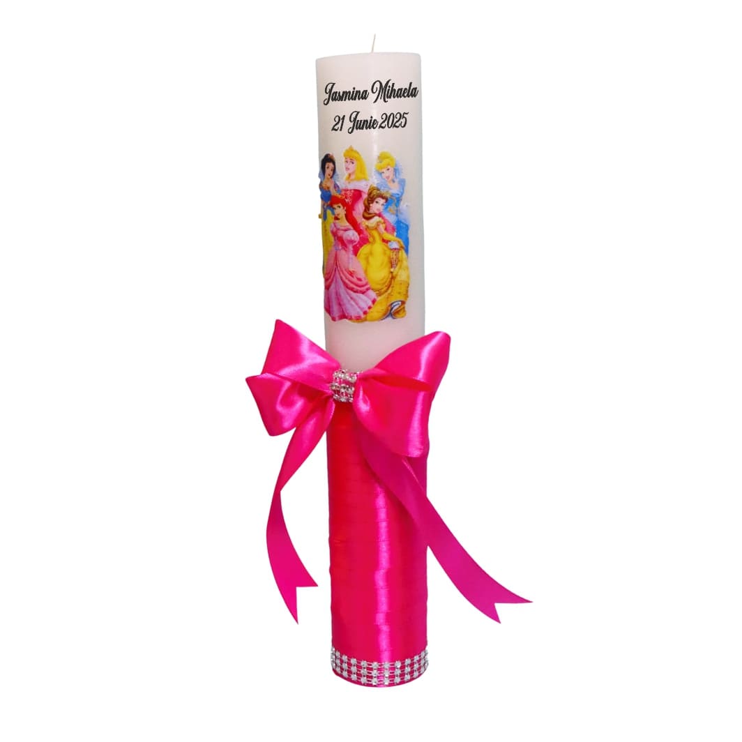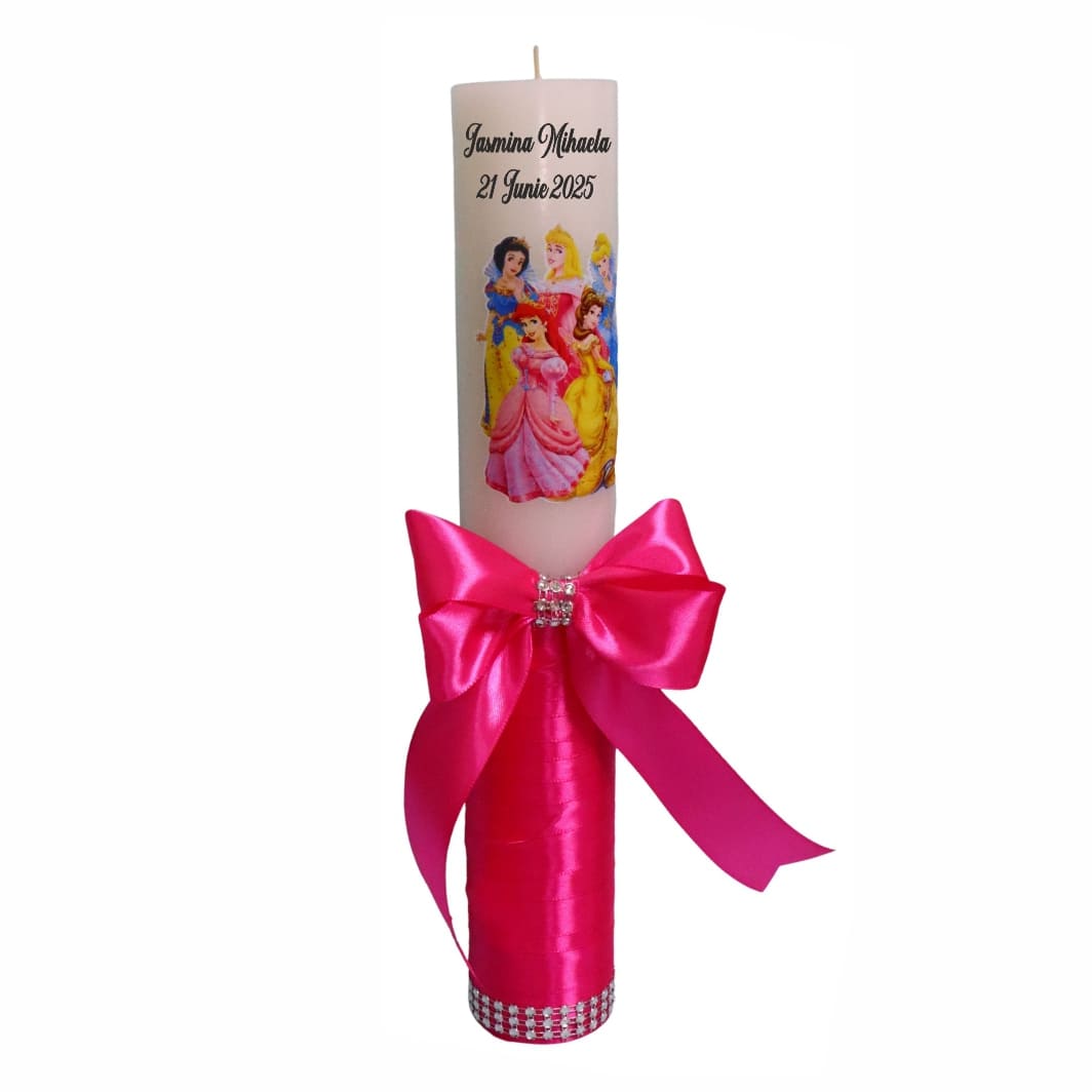 Lumanare pentru taina botezului, cu tematica Printesele Disney, decorata cu panglica, banda cu strasuri si fundita asortata.