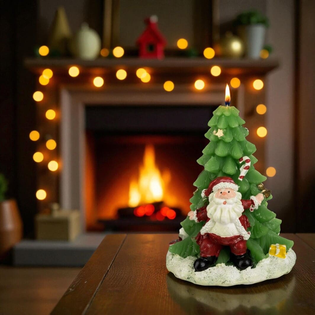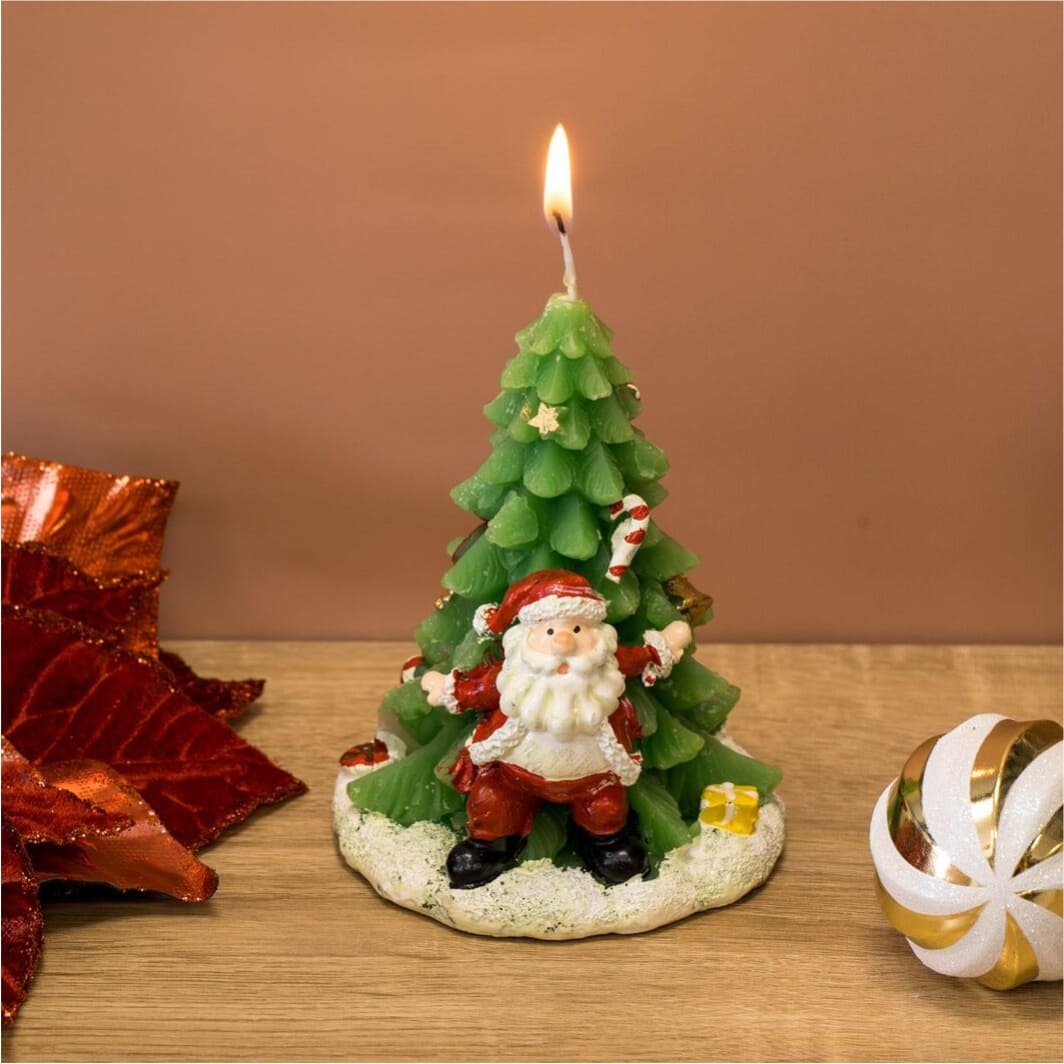 Lumanarea Craciun, Model Brad Impodobit cu Mos Craciun si Cadouri este alegerea ideală pentru a aduce farmecul sărbătorilor direct în casa ta.