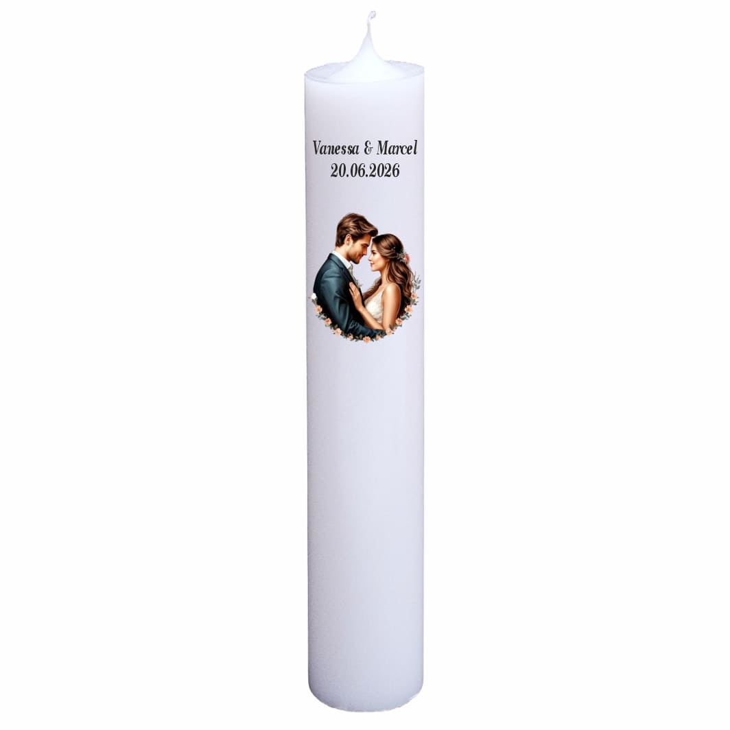 Aceasta lumanare personalizata nunta este conceputa pentru a adauga eleganta si emotie in timpul cununiei religioase. Modelul LN048 are o inaltime de 35 cm, este realizat pe suport alb si decorat cu flori portocalii. Se livreaza la 1 bucata si poate fi personalizata pentru a reflecta unicitatea mirilor.