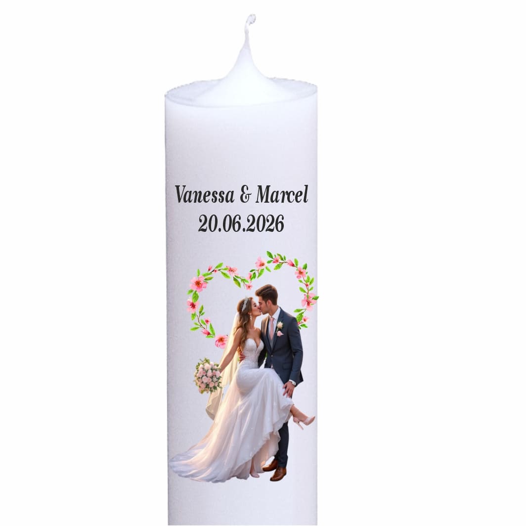 Aceasta lumanare personalizata nunta este conceputa pentru a adauga eleganta si emotie in timpul cununiei religioase. Modelul LN058 are o inaltime de 35 cm, este realizat pe suport alb si grafica cu miri si ghirlanda florala. Se livreaza la 1 bucata si poate fi personalizata pentru a reflecta unicitatea mirilor.