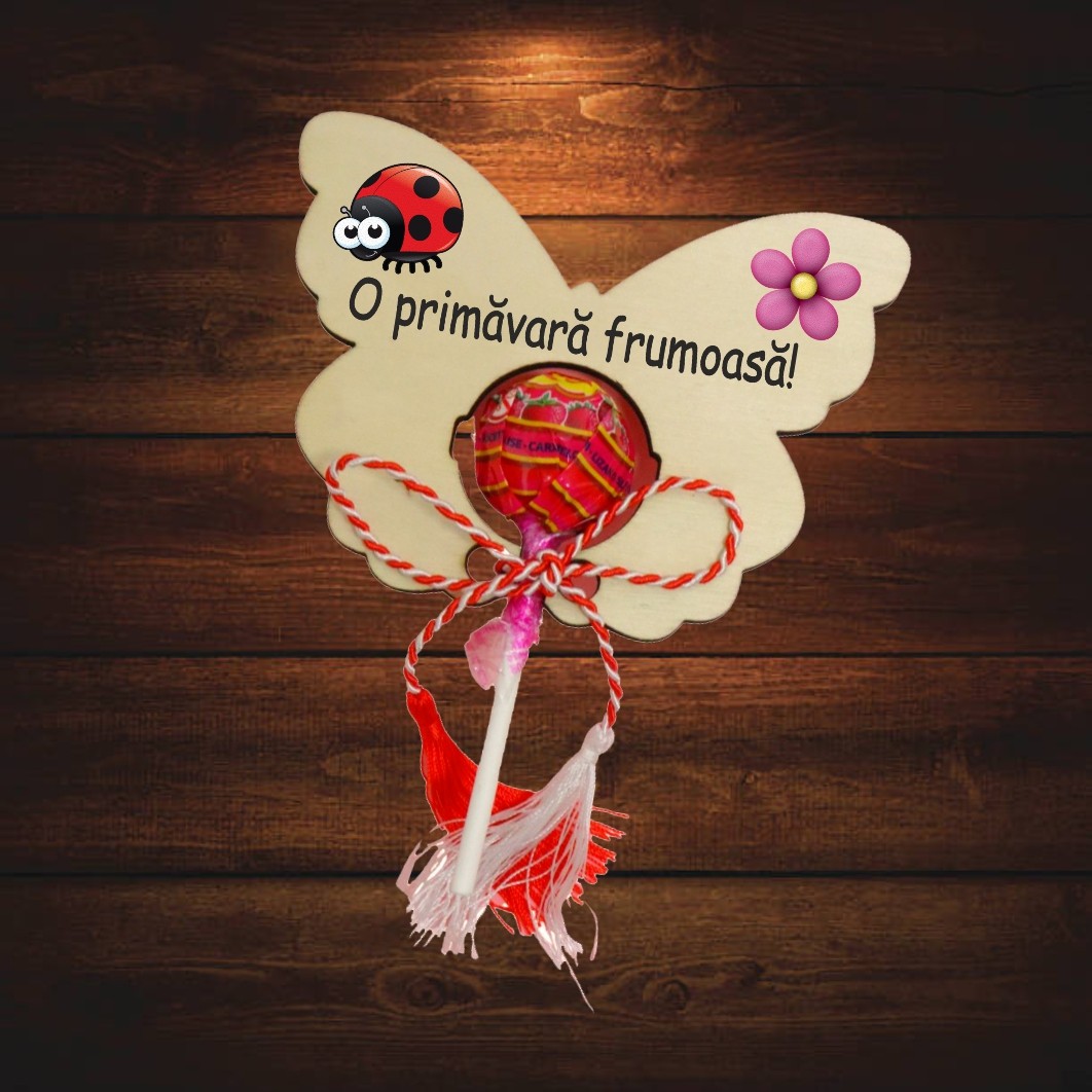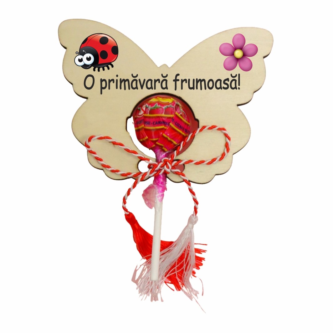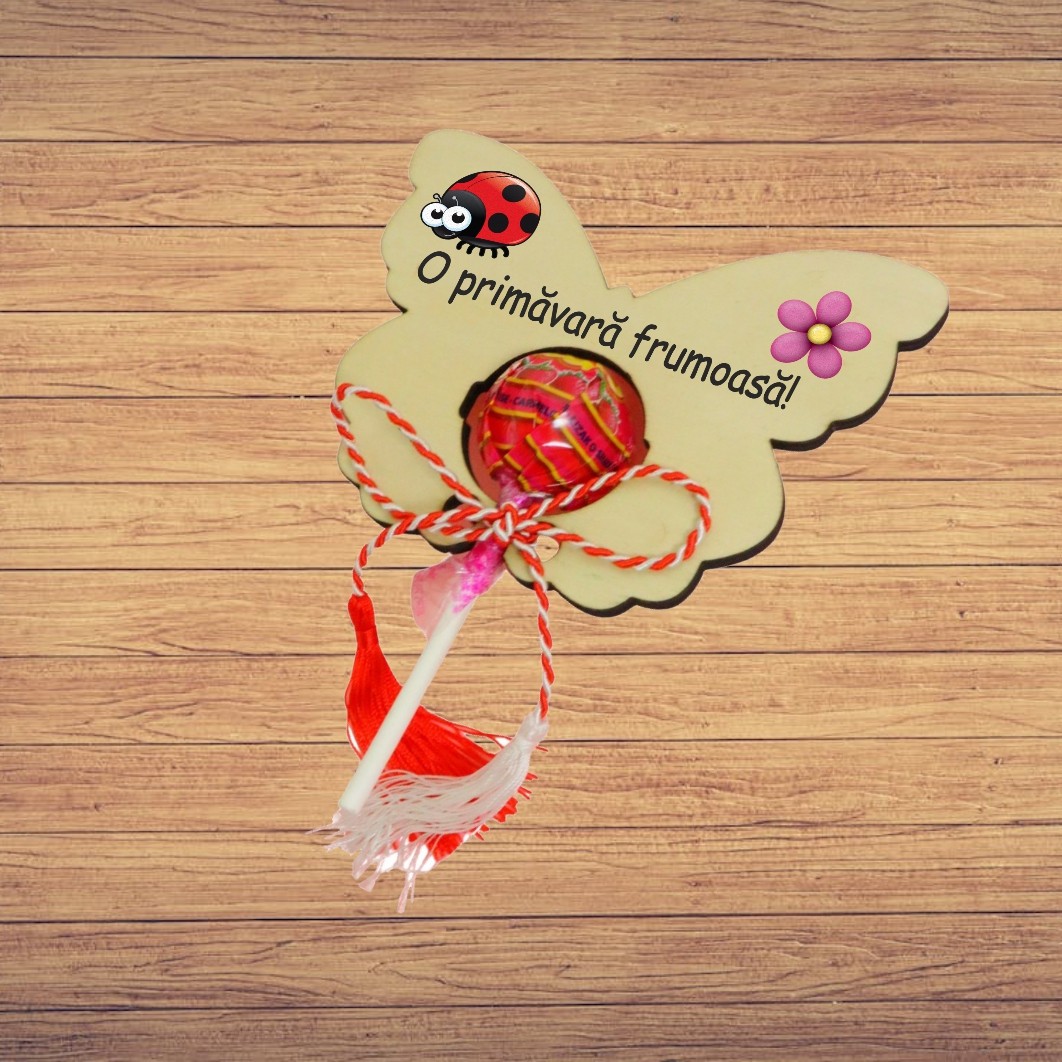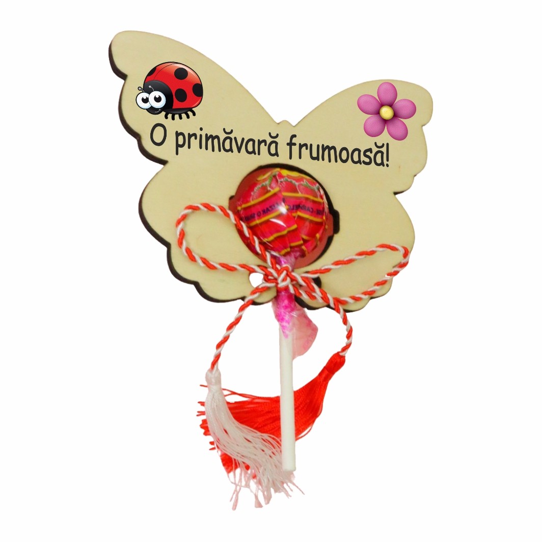 Martisor, Bomboana Chupa Chups, Fluture, Lemn, 11×8 cm, Primavara, MBUV014