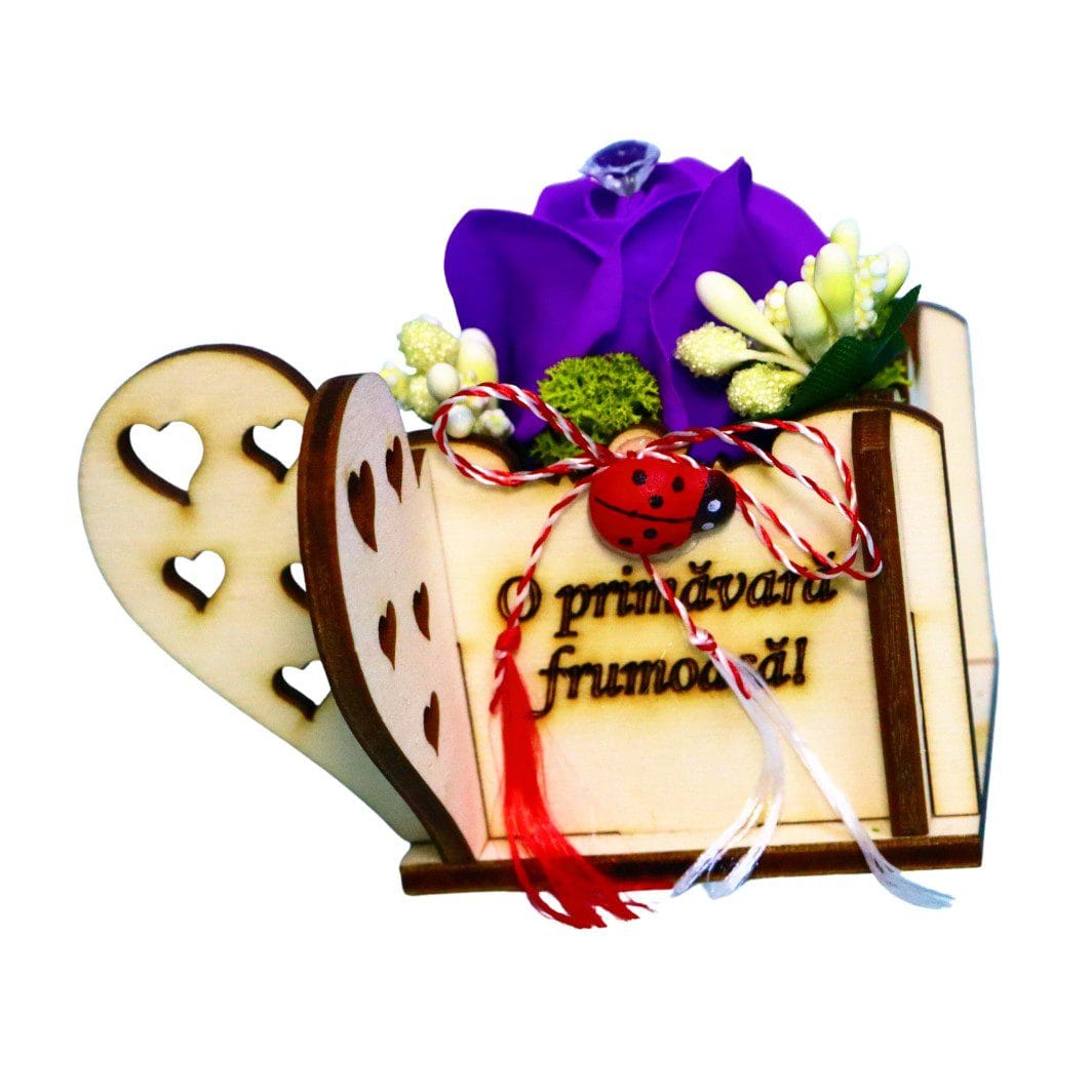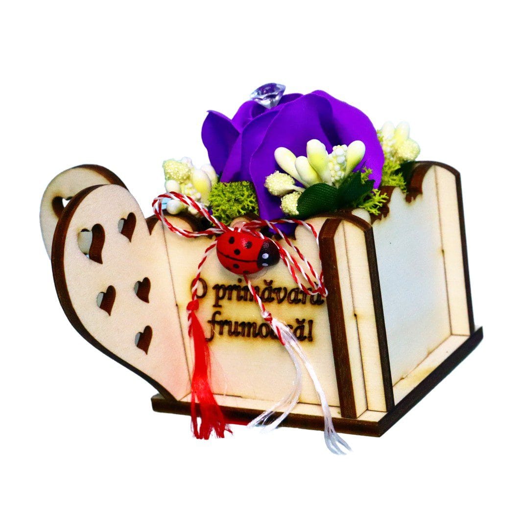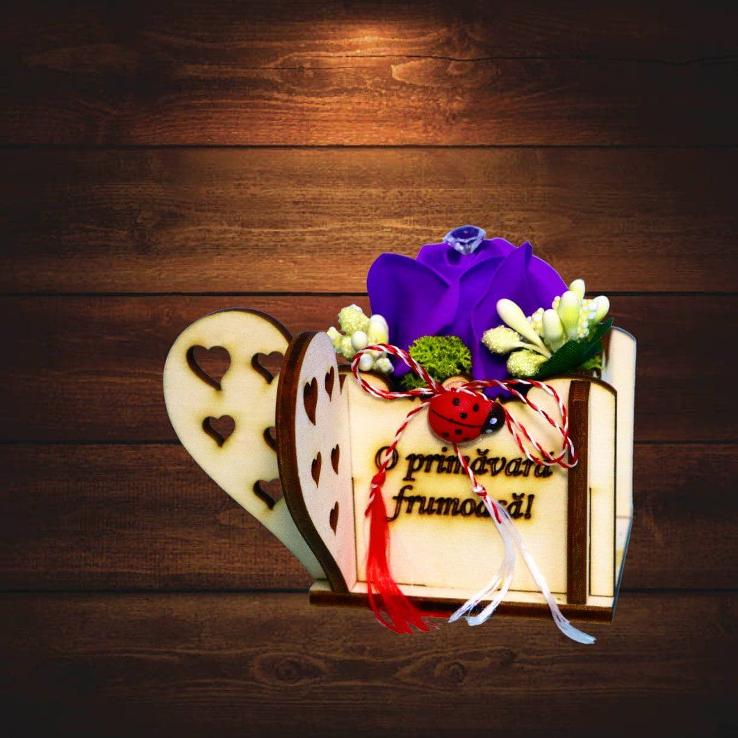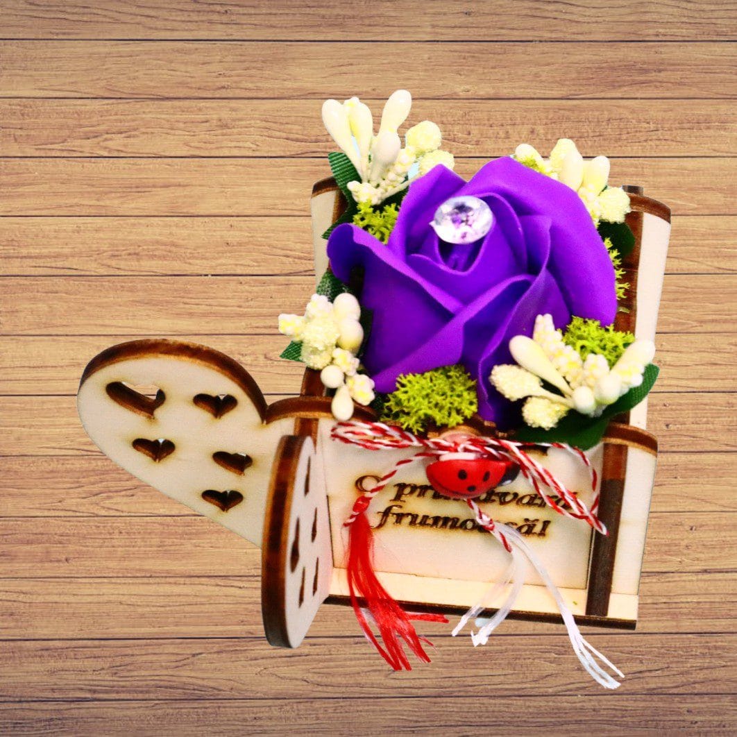 În interiorul acestui mărțișor în cutie se află o cutie din lemn, gravată cu mesajul „O primăvară frumoasă!”, care adaugă o notă personală și festivă. Elementul central este reprezentat de un trandafir de săpun cu diamant artificial în vârf, ce oferă un plus de eleganță și rafinament. Trandafirul este decorat cu licheni naturali și stamine, creând un contrast armonios între texturi și culori.