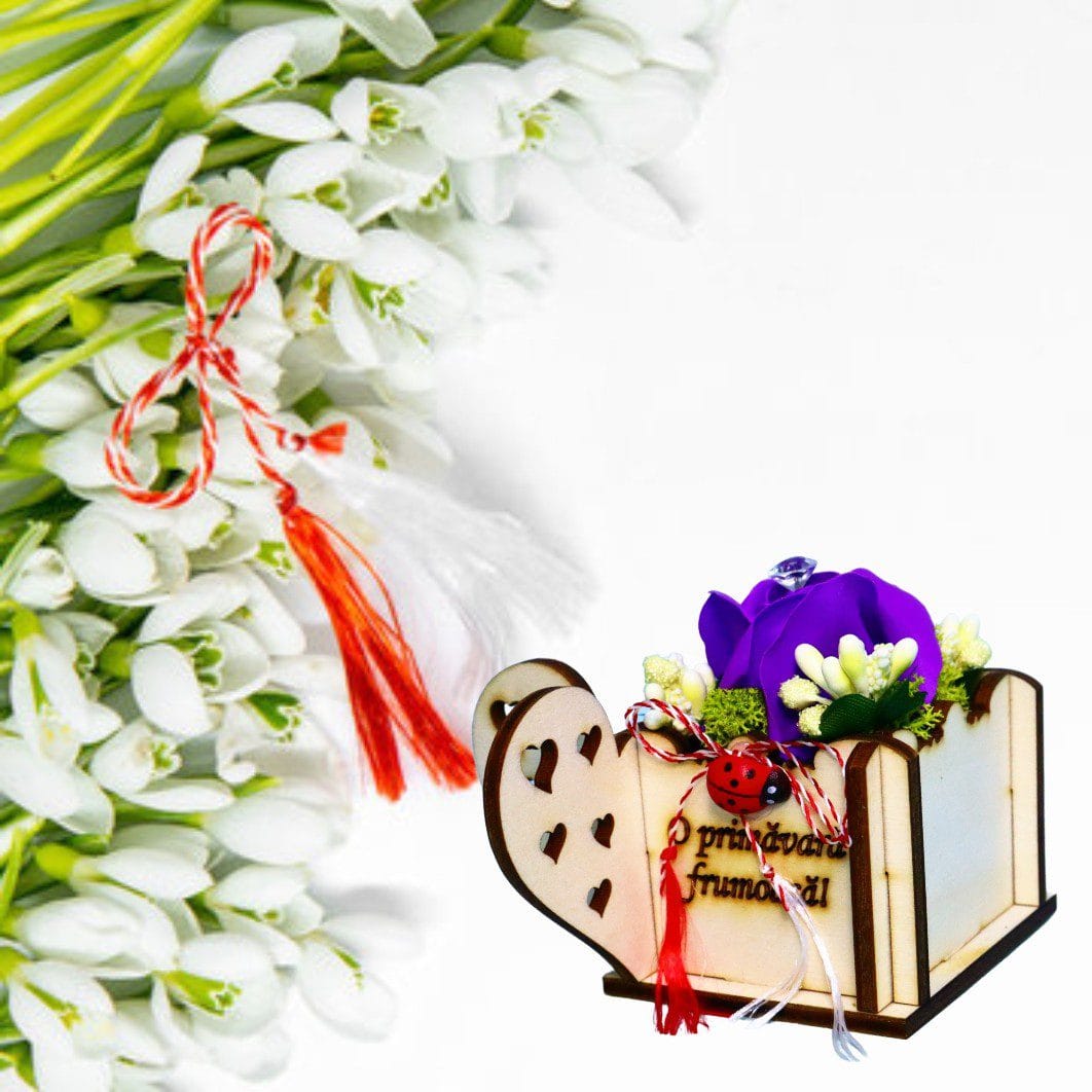 Acest mărțișor în cutie este un cadou delicat și elegant, creat special pentru a marca începutul primăverii într-un mod original și emoționant. Realizat cu atenție la detalii, produsul îmbină elemente decorative naturale cu un mesaj cald, fiind alegerea ideală pentru a transmite apreciere și afecțiune cu ocazia zilei de 1 Martie.