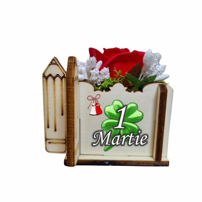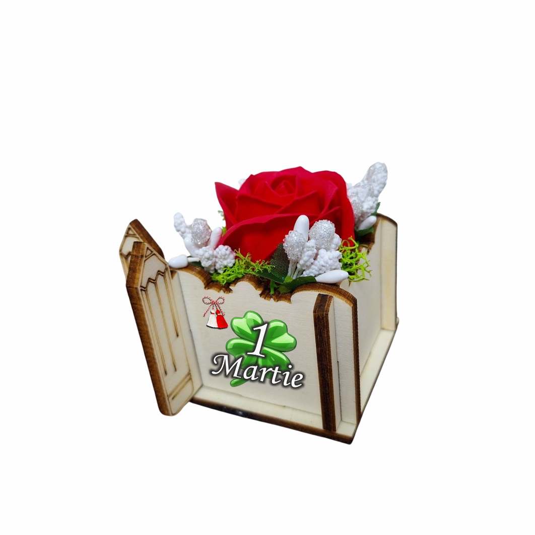 Cutia are dimensiunile de 7 × 7 × 6 cm, fiind suficient de compactă pentru a fi oferită cu ușurință, dar în același timp destul de spațioasă pentru a găzdui un aranjament floral miniatural impresionant. În interior se află un trandafir de săpun roșu, accesorizat cu un mic diamant artificial în vârf, licheni naturali și stamine decorative. Trandafirii de săpun sunt cunoscuți pentru aspectul lor natural, textura fină, mirosul plăcut și faptul că nu se ofilesc niciodată, ceea ce face ca acest mărțișor să rămână o amintire de lungă durată.