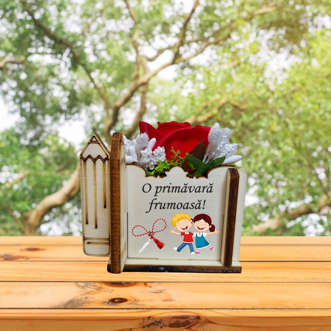 Martisorul contine o cutie din lemn printata UV si un tradafir de sapun cu un diamant(artificial) in varf, decorat cu licheni naturali si stamine.