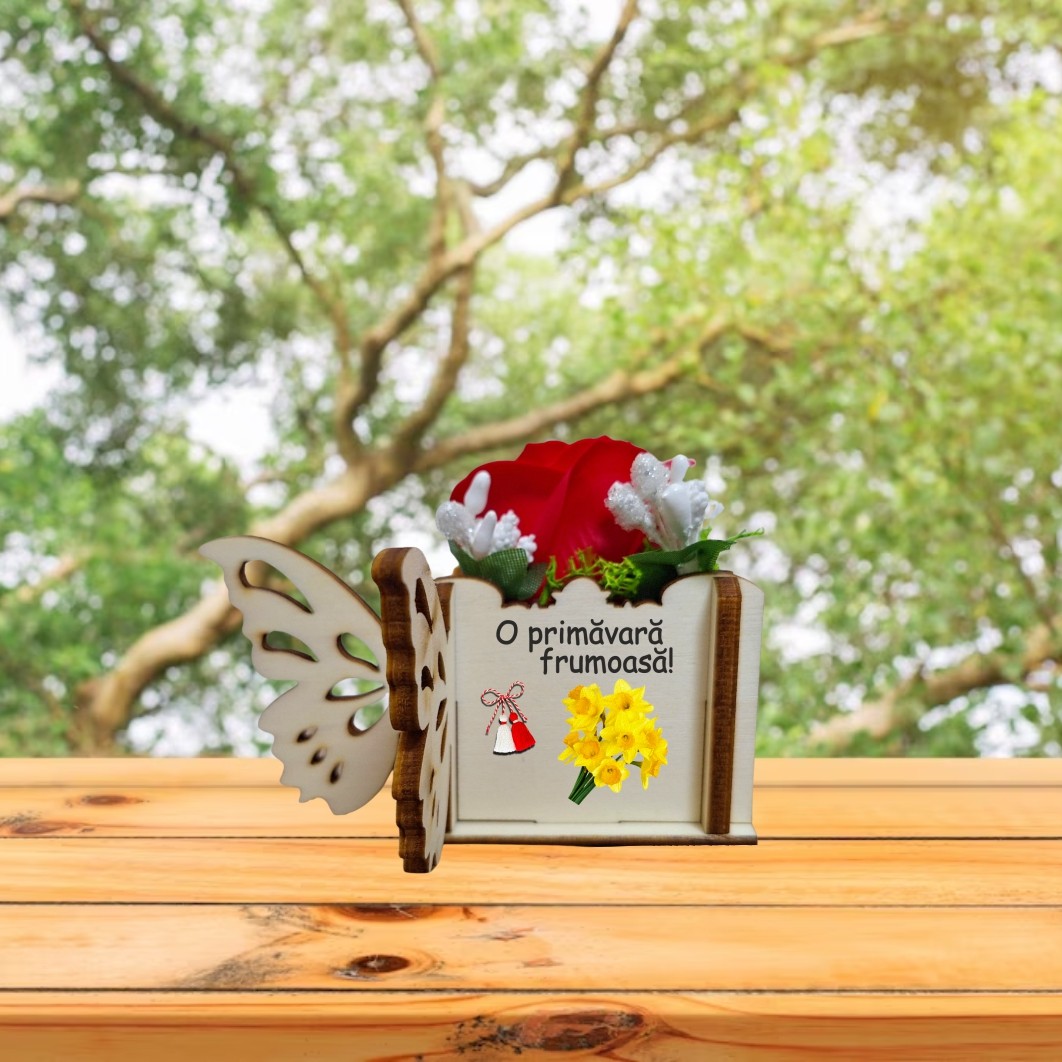 Martisorul contine o cutie din lemn printata UV si un tradafir de sapun cu un diamant(artificial) in varf, decorat cu licheni naturali si stamine.