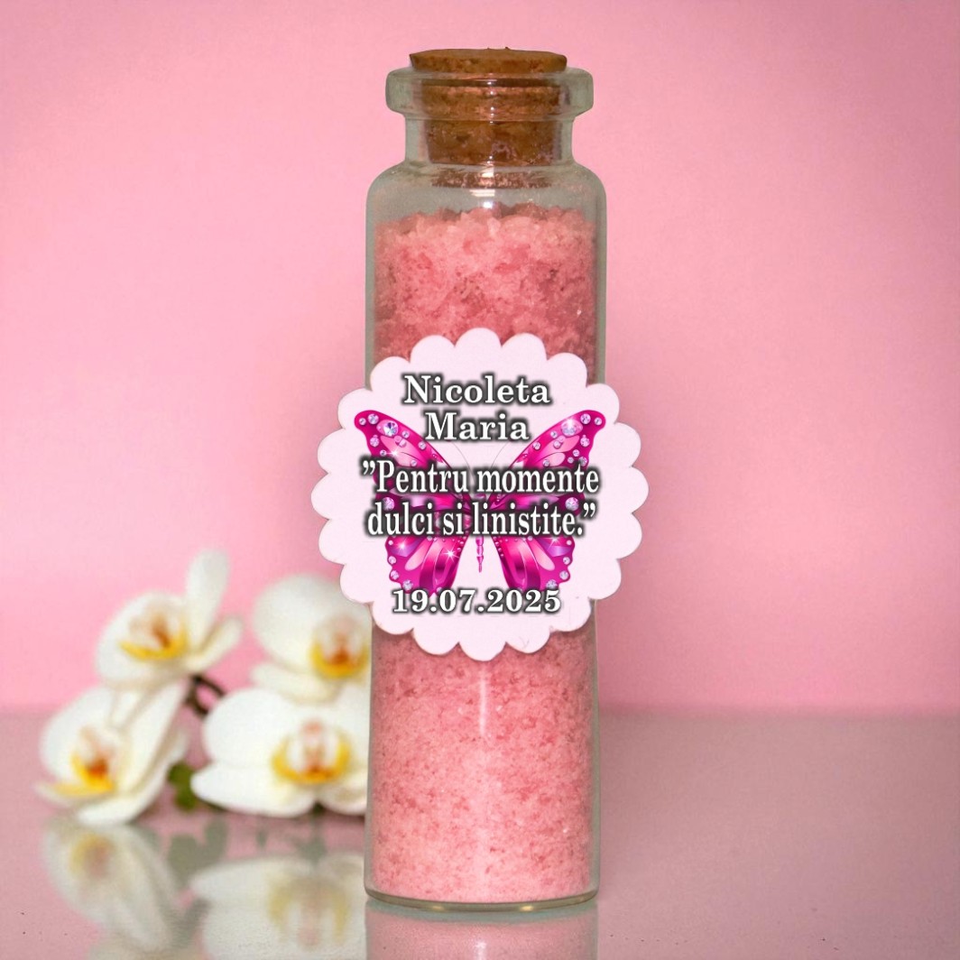 Transformă botezul micuțului tău într-un eveniment memorabil, oferind invitaților o mărturie cu adevărat specială: o sticluță elegantă umplută cu sare de baie, 100% naturală, cu arome delicate și efect relaxant.